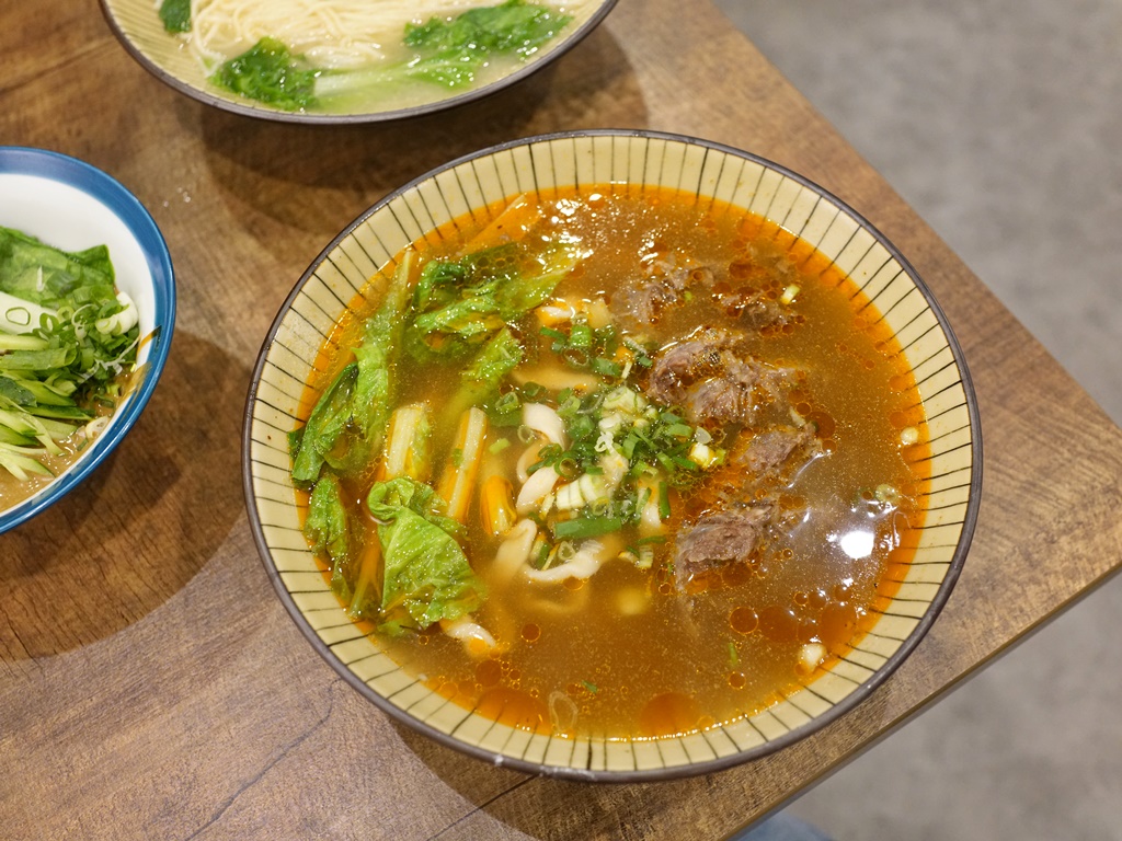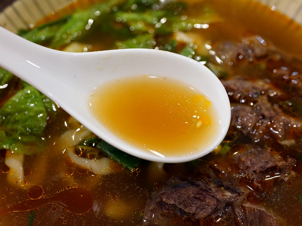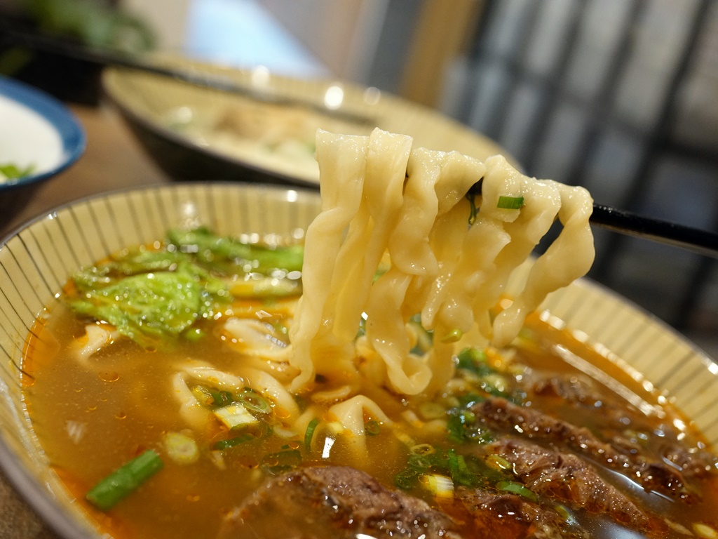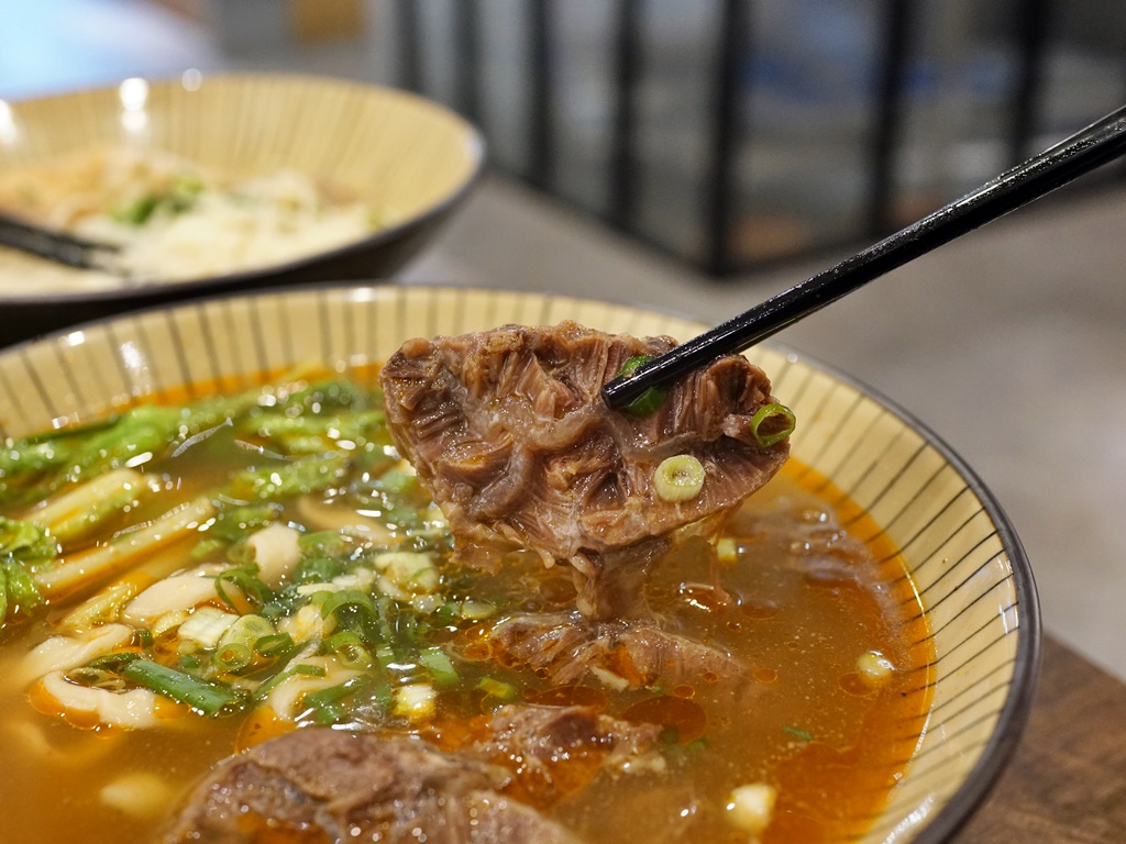 以牛肉麵來說價格算是偏貴,不過肉給的份量還蠻實在的,燉的軟嫩入味,是好吃的牛肉!湯頭微辣帶有淡淡中藥香,味道不錯但稍嫌不夠濃郁,算是清爽型的紅燒基底,刀削麵口感扎實有彈性,跟牛肉湯頭很搭調~