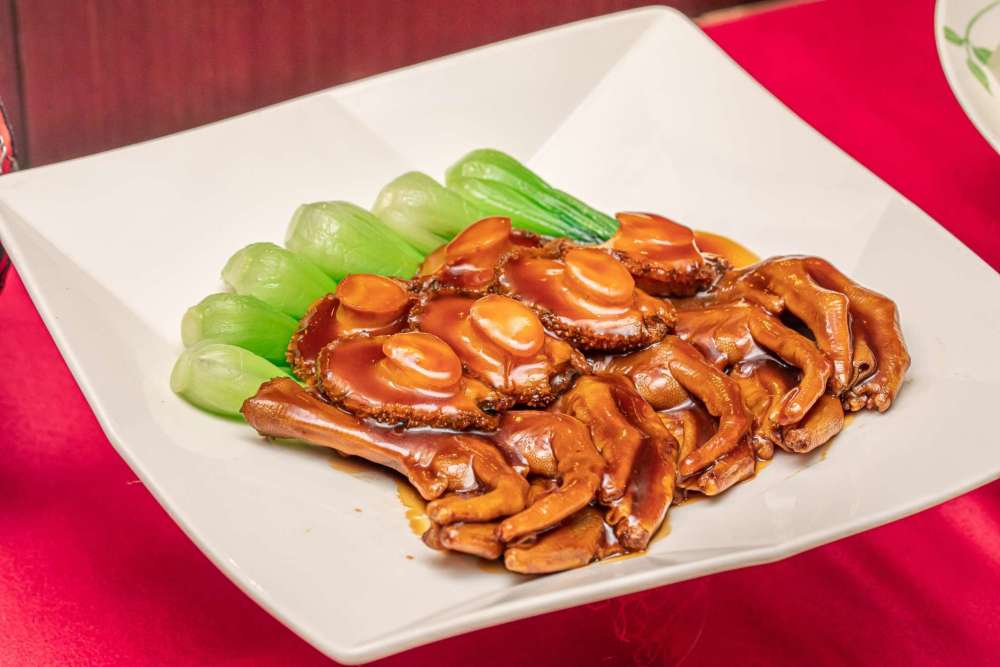 不只是彈牙有嚼感的豬蹄筋本身就正點,再加上花膠、烏參,放入蒜頭、醬油及糖調味,入口軟爛富含膠質。