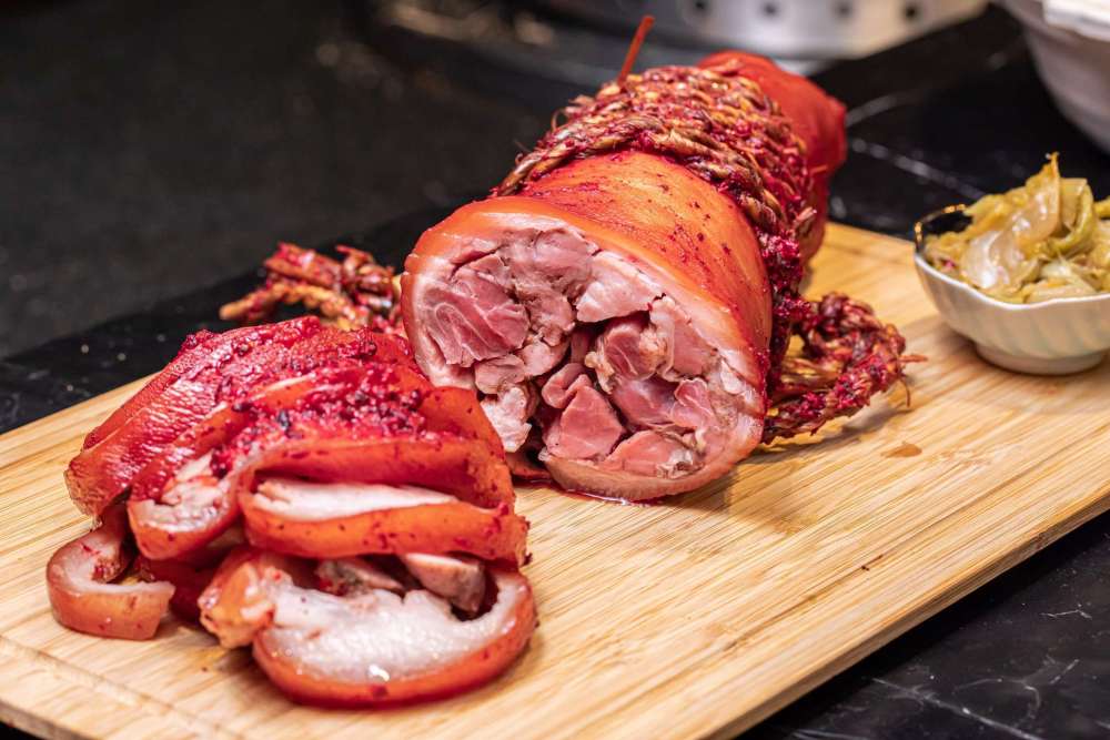 主廚挑選2公斤的台灣國產豬前腳,先是用了花椒、五香、胡椒、醬油等香料入味,再用月桃葉綑綁妥增加香氣,再搭配選用宜蘭紅糟、薑、白醬油、糖等香料調製滷汁,一口氣慢火滷製超過兩小時才能完成