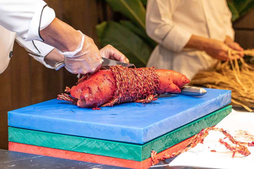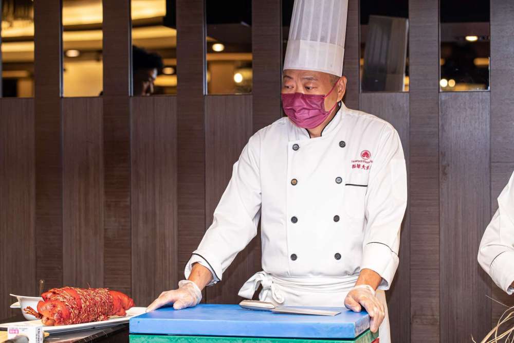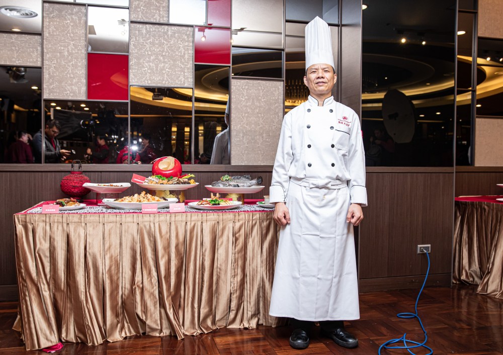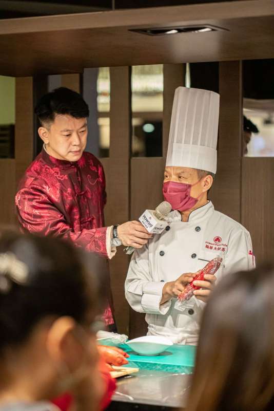 接下來,就由蓬萊邨台菜餐廳主廚王永宗為大家現場示範新菜色蓬萊月桃紅糟捆蹄(每份2,200元,限量50套)