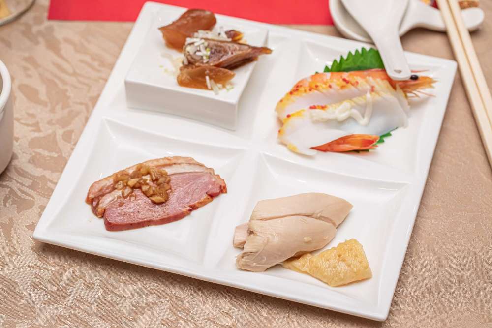 裡面的菜色一共有紹興醉鮮蝦、麻辣牛筋、涼拌花膠片、櫻桃鴨胸、魚子醬墨魚、烤野生烏魚子、鹽焗黃金雞與五味九孔,基本上所有的特色小菜通通一網打盡,很適合一家人點上一份吃個過癮!
