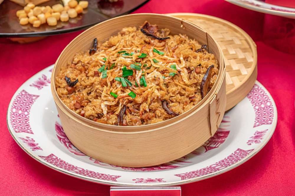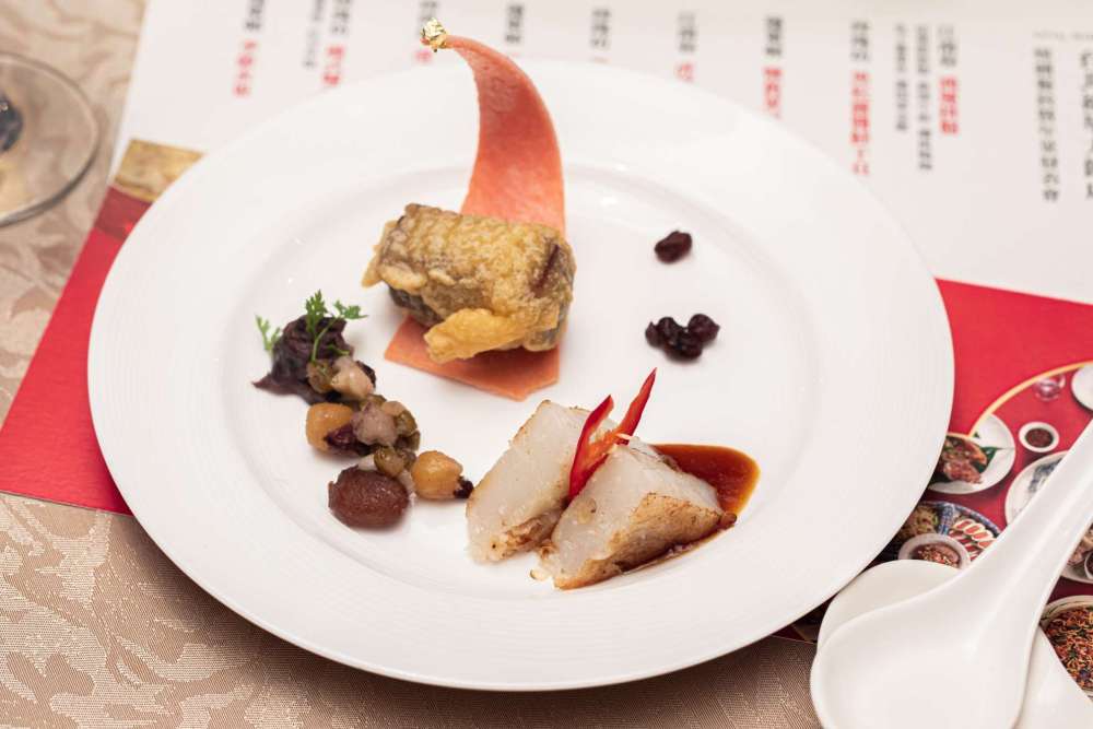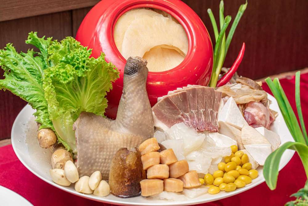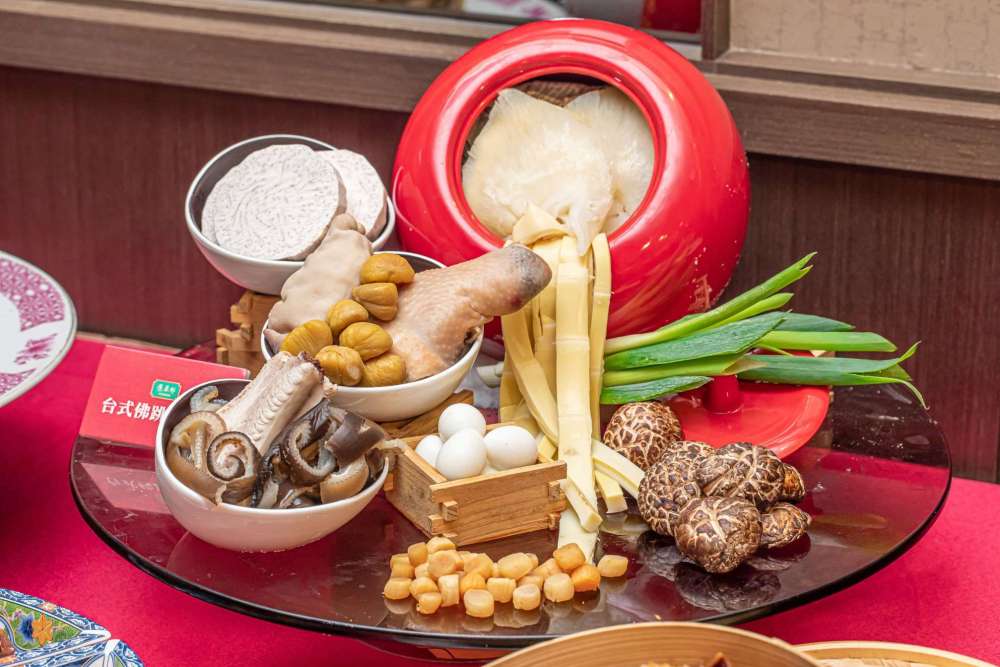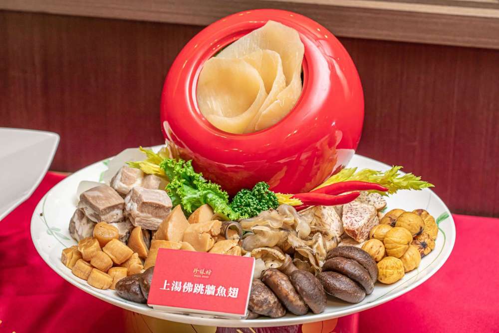 其中菜色包括清炖佛跳牆排翅(含甕)跟三隻帝王蟹肉焗龍蝦,以及虎掌花膠燒烏參跟六顆紅燒黃金鮑魚,搭配油浸龍虎斑跟紹興醉雞腿,甜點部分則是桂圓紫米糕(素食者可食)