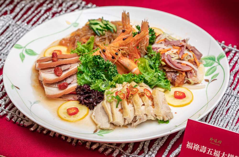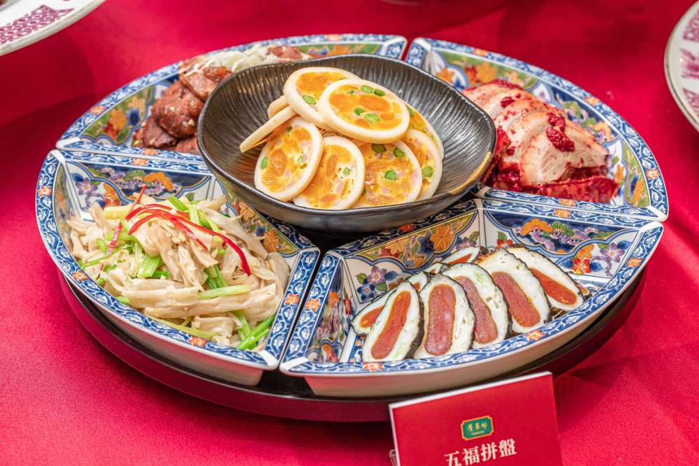 包括紅糟鵝肉、芹菜龍膜、蛋黃中卷、麻辣中腱、孔雀烏魚子等五種經典手路菜的拼盤,名為五福拼盤,風味相當不錯,而且當作年節菜色之得很有派頭