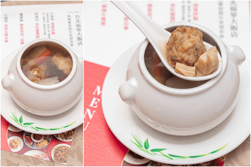 食材包括白果、黃魚肚、桂竹筍、豬腳尖、大油雞腿、五花排骨、響螺肉、杏鮑菇、蒜頭、中排翅、老母雞高湯、干貝,但都沒有經過油爆而是燙過之後搭配雞湯,口感香濃淡一點都不油膩哩!