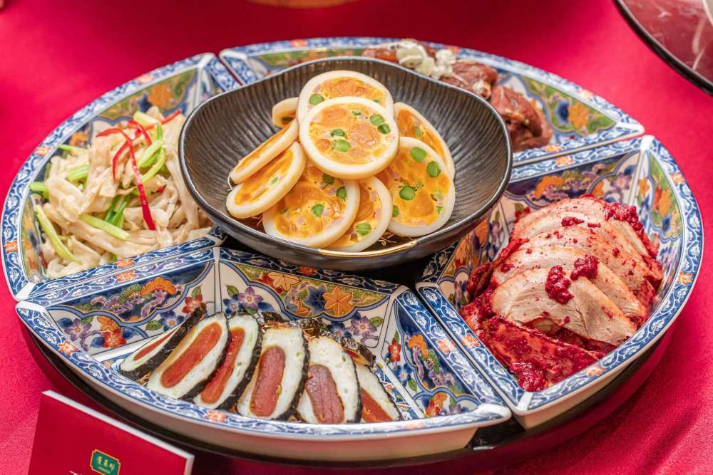如果想要簡單一點的話,包括紹興醉蝦、香滷牛腱、涼拌蜇皮、蘇式燻魚、櫻桃鴨胸、茶燻墨魚的鴻運六喜拼盤(988元,份)也是不錯的選擇