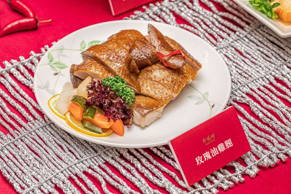 這道珍珠坊招牌菜玫瑰油雞腿,不只用甕仔雞腿搭配以中藥材跟紹興酒,另外還加上添加玫瑰花瓣滷製