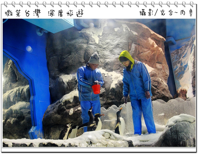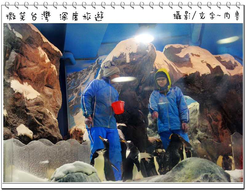 ▲肉魯餵食企鵝秀登場囉!我拿了一桶10幾隻的柳葉魚進去,一開始企鵝美女餵養員跟肉魯說:『穿上我們的Gore-Tex會比較保暖喔。』肉魯:『我身上這件就是Gore-Tex….』,哈..不過我還是換了他們的這件藍色的外套,進入之前要消毒,還要穿上藍色褲子,手上要戴上一層手套和一層塑膠手套,然後腳上要穿上雨鞋,層層消毒關卡就是怕不小心把細菌傳染給可愛的企鵝。