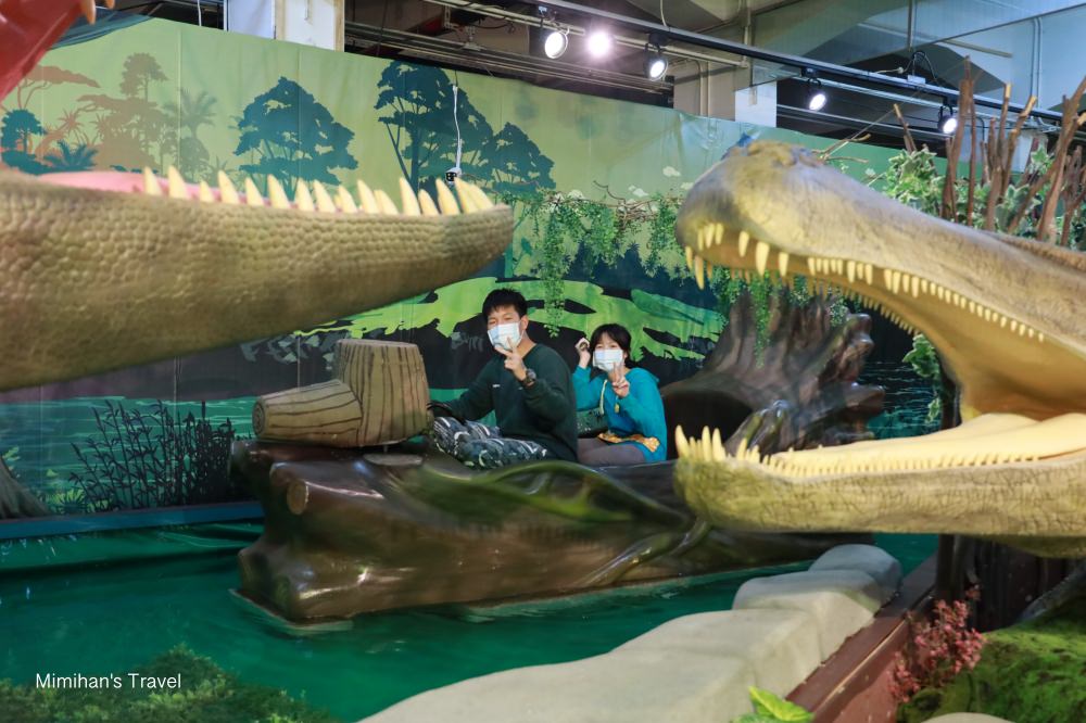 走進侏羅紀恐龍水世界的第一站就是搭乘獨木舟,乘船的時候工作人員還會發送手電筒,當獨木舟穿過烏漆麻黑的洞穴時,就很像是進入時光隧道,一出洞口就來到恐龍世界。(獨木舟憑票可以重複搭乘)