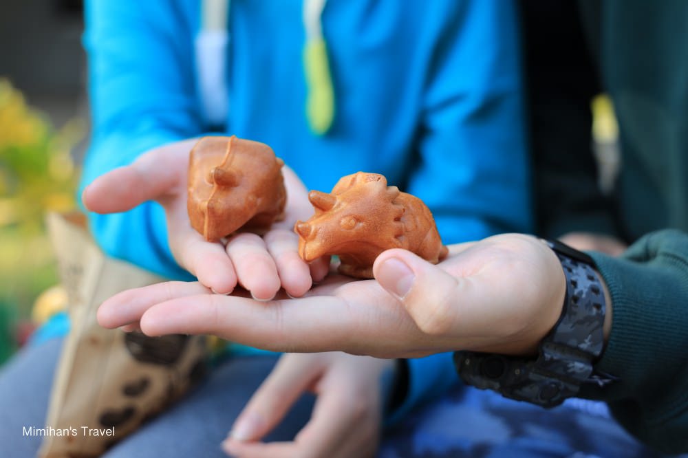 櫃檯旁邊還看到可愛的小三角萌龍雞蛋糕,雖然一份70元有點小貴,但看到可愛的三角龍就融化惹!直說捨不得咬下去,而且其實外脆內軟香也還不錯吃。
