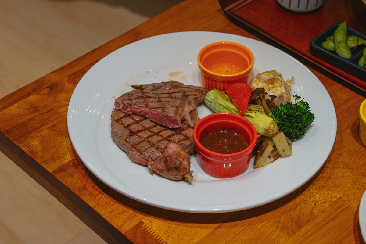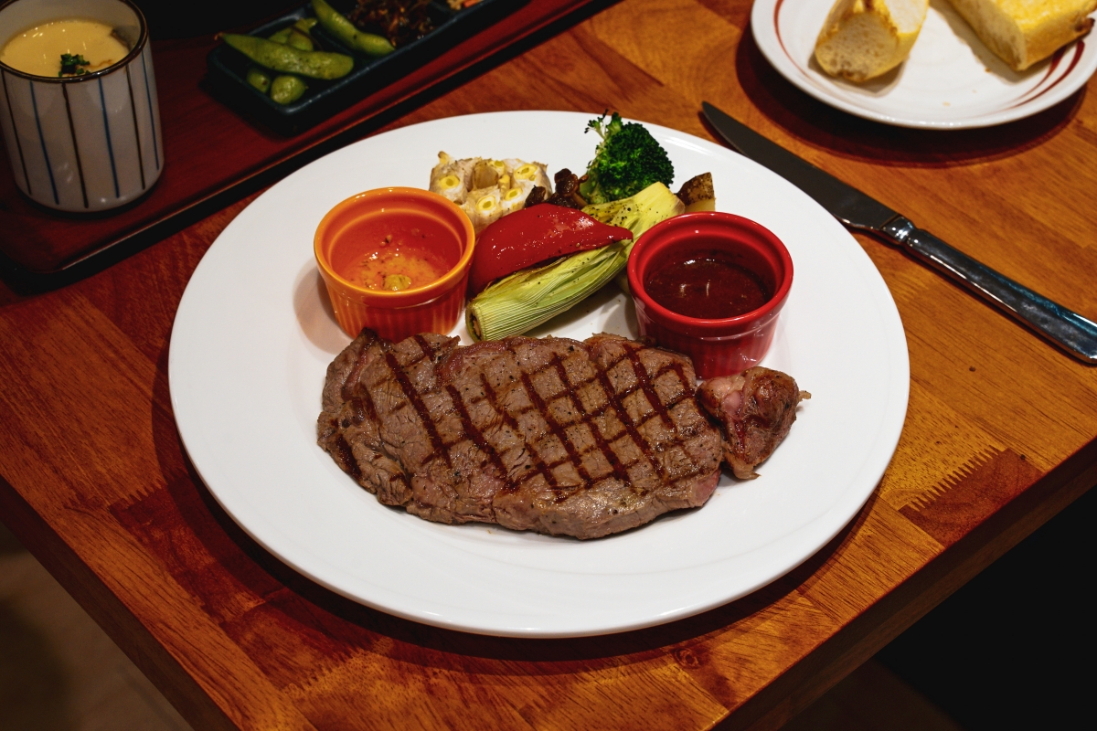 選用 choice 等級的肋眼牛排,先煎後烤,靜置後鎖住肉汁,牛肉本身的香氣非常足夠,咀嚼的時候香氣會在口中陣陣散發。店家建議熟度為五分熟,吃起來柔軟不韌,搭配旁邊附上的奶油蒜蓉醬與紅酒醬增添風味,也可以直接沾取少量的海鹽品嚐原味。旁邊的烤蔬菜與大蒜配著吃也還不錯,我覺得薯塊酥香鬆軟很讚~