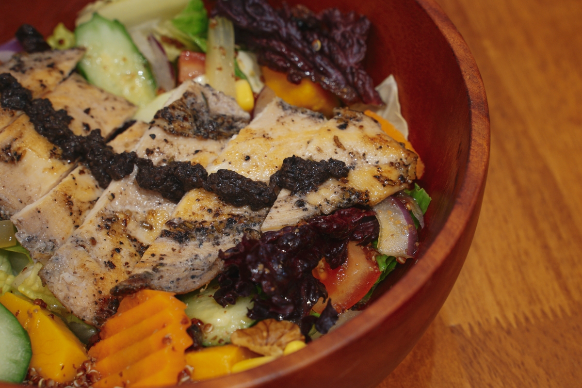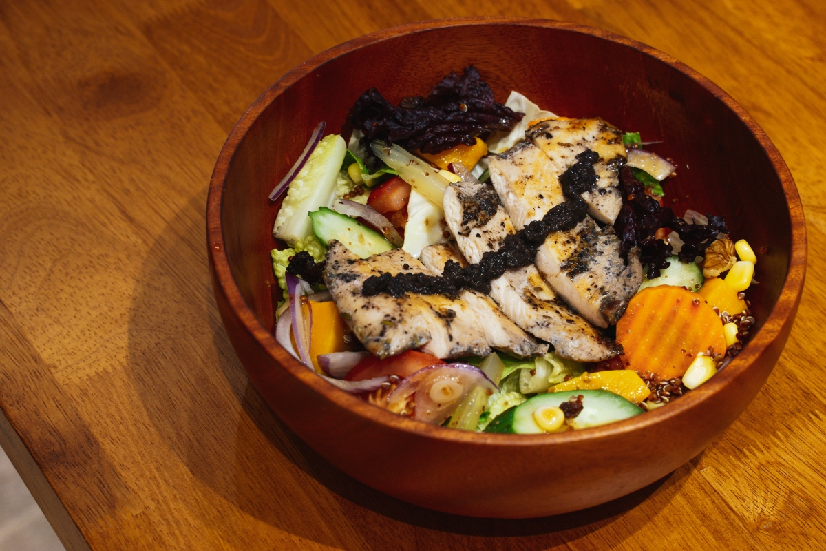 選用新鮮溫體雞肉,採舒肥的料理方式鎖住肉汁,使口感保持柔嫩帶有彈性,搭配滿滿新鮮生菜,最後淋上特製松露油。攪拌後滿滿的松露香氣散發,而雞肉本身帶有香料的味道,搭配起來更有層次。