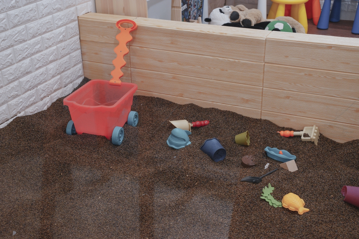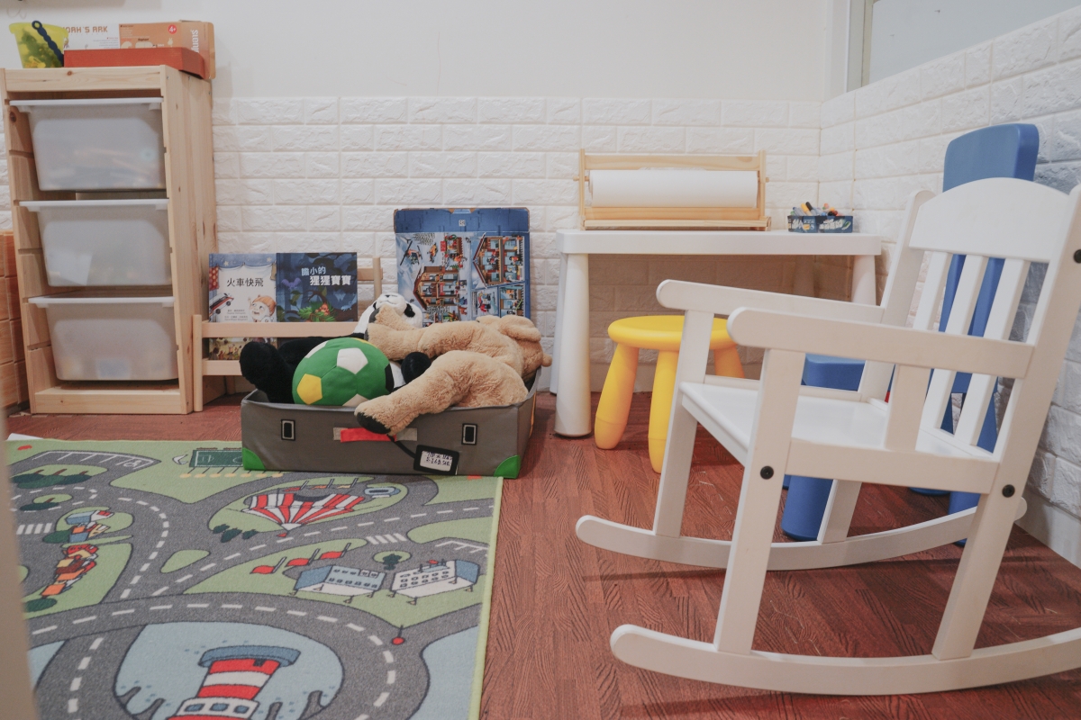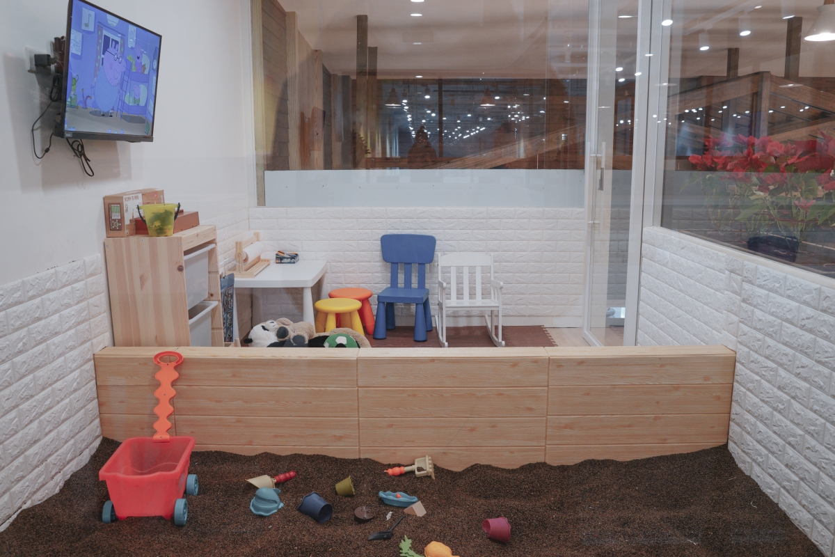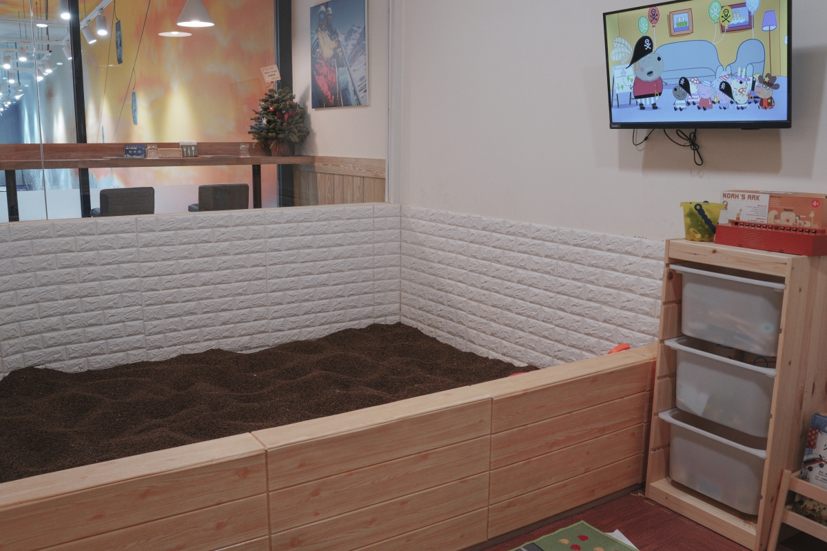 二樓設置了兒童遊樂空間,裡面有決明子沙坑、玩偶、故事書,還有電視播放卡通,孩子們可以在裡面待上一段時間,大人也才能好好享用餐點,喘口氣呼吸一下自由的空氣。