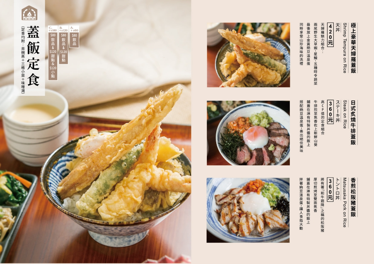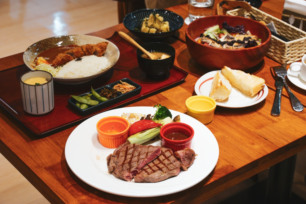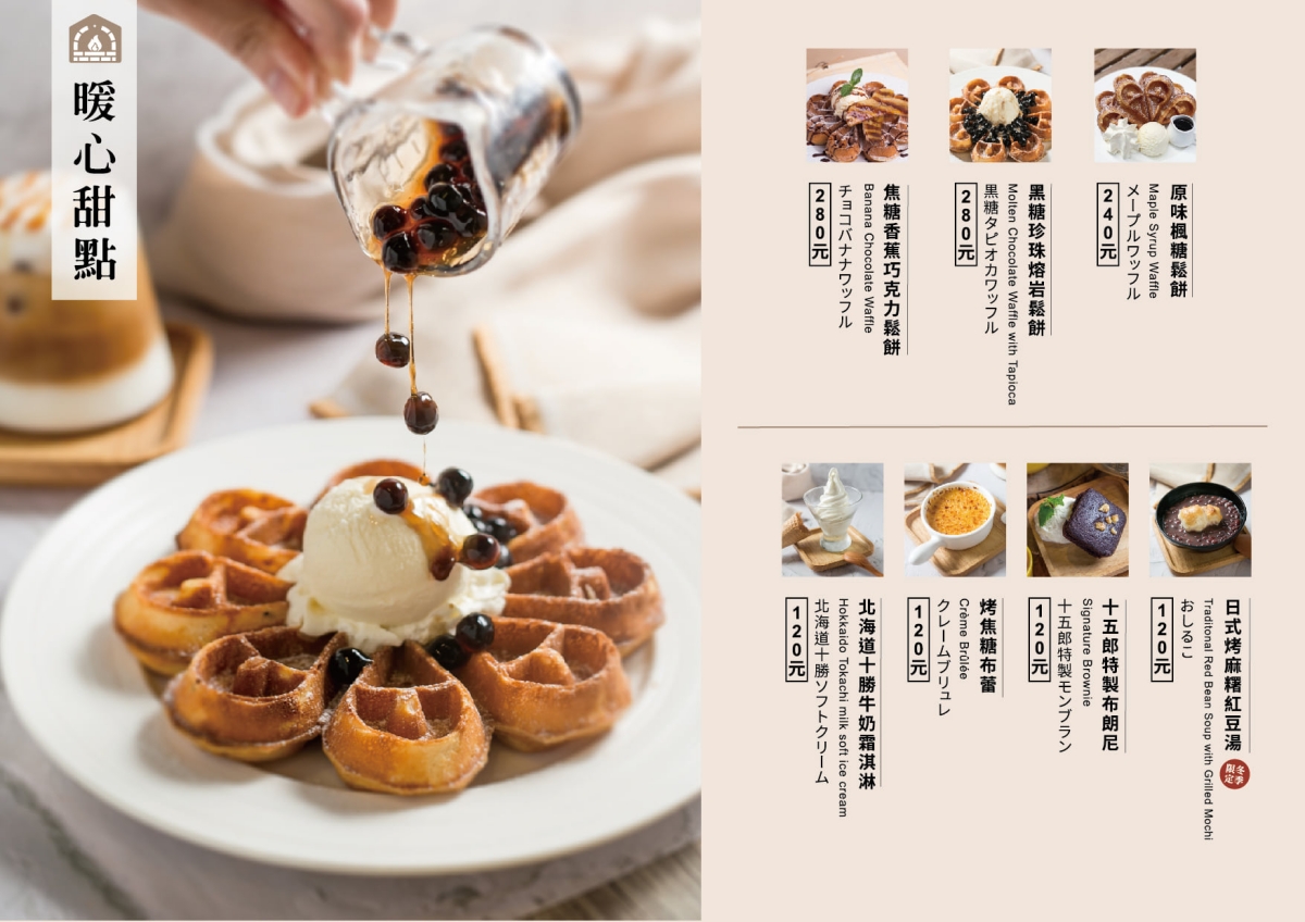 餐點選擇多樣,不論是日式的丼飯、蓋飯、烏龍麵、咖哩飯,還是西式牛排、燉飯、沙拉⋯⋯等等不同種類的餐點可以滿足各種不同口味喜好的朋友,讓聚餐更歡樂!飲品提供咖啡與茶飲,甜點則有美味的麻糬鬆餅、烤麻糬紅豆湯、北海道十勝牛奶霜淇淋。來到十五郎用餐,從前菜到甜點通通包辦不用煩惱!
