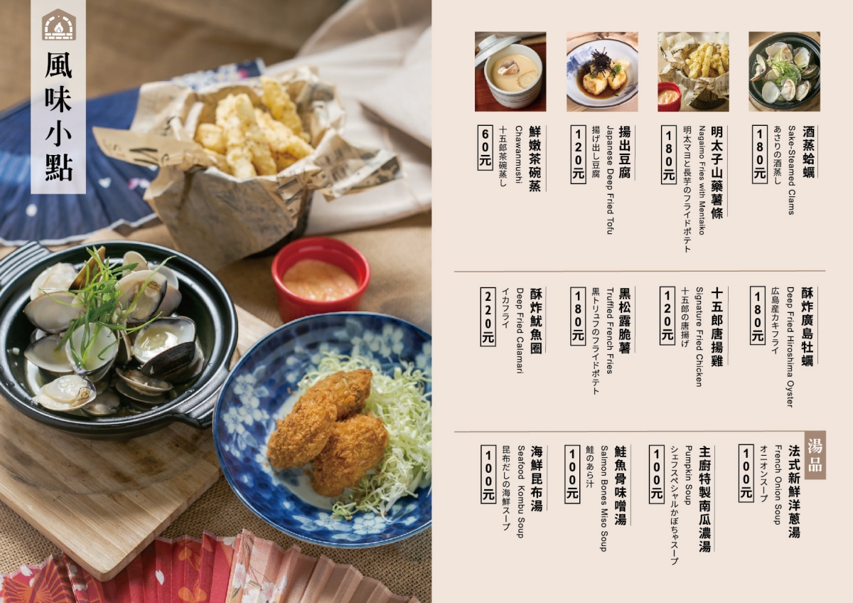 凡於 3/31 前至十五郎日式洋食堂「台北內湖店」或「竹北文興店」 任一店用餐消費,出示本篇部落格文章或是社群貼文,只要有點主餐,就送價值 $120元的風味小點一份。