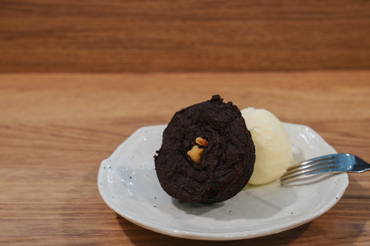 吃到最後其實真的吃不下,看到布朗尼旁邊還有一球冰淇淋,真的快撐死~但我還是挖了一口布朗尼來吃,一吃發現覺得口感跟味道都還不錯耶!布朗尼苦甜香適中,不甜膩,口感鬆軟帶一點彈性,沒有乾硬的感覺,可以!