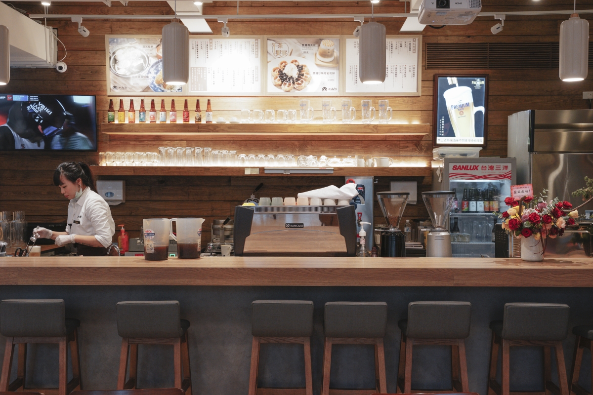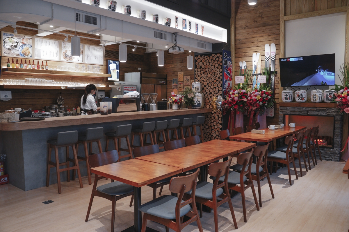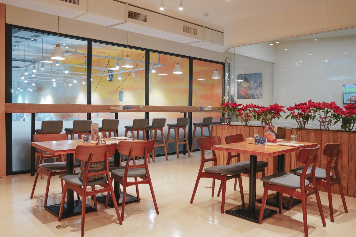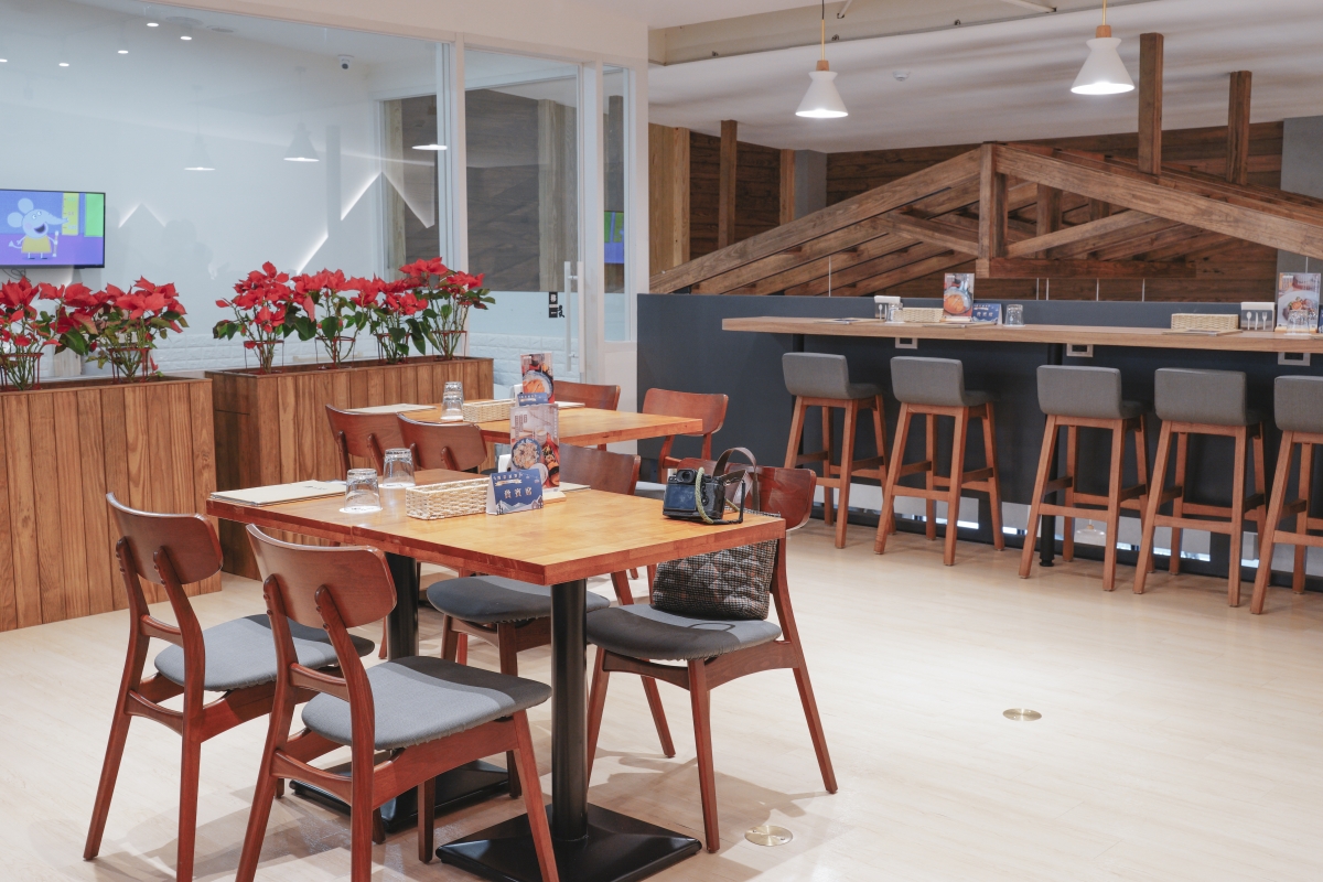 一樓空間有吧台與用餐座位,還有一個壁爐的造景,就像滑雪場裡小木屋中會有的貼心暖爐,感覺起來就暖呼呼的。空間十分寬敞,兩層樓的大空間,很適合大家來這裡練習滑雪,也能盡情享用餐點。