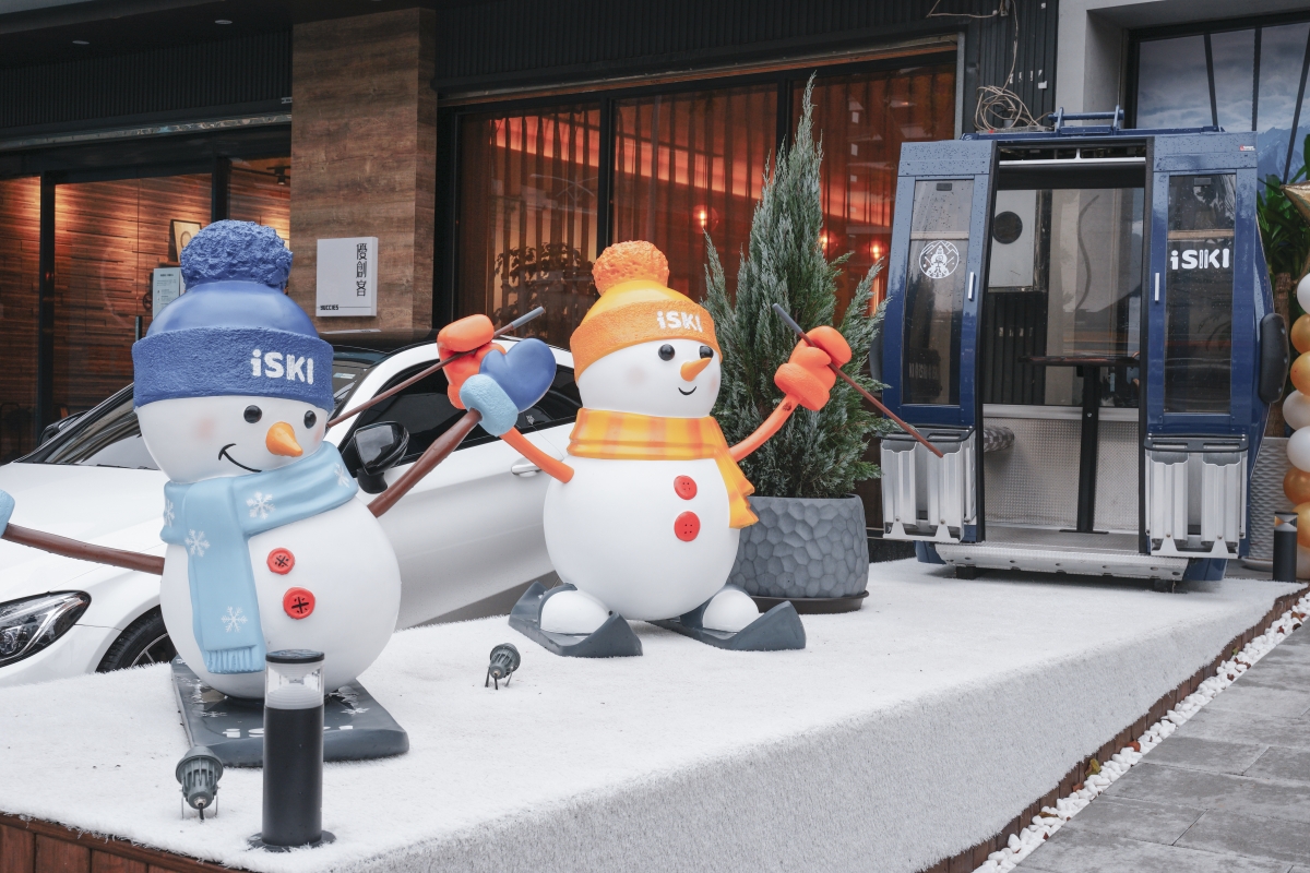 門口的纜車和雪人裝飾、雪地設計實在太逼真拉!而且我們用餐那天好冷,很有在雪場的感覺。還有還有!一定要跟纜車拍照呀~滑雪的人都是搭纜車到山上去滑雪的,這對滑雪的朋友們來說肯定親切感十足。