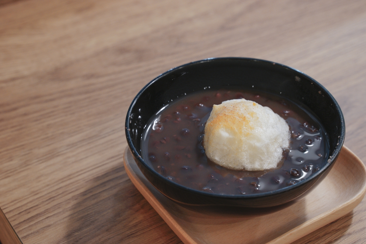 不吃冰冷食物的人可以來一碗熱呼呼的紅豆湯哦!使用萬丹紅豆熬煮兩個小時,紅豆口感綿密香甜,上面的烤麻糬比較像是米香,口感爽脆,不是印象中的軟Q黏牙麻糬哦!