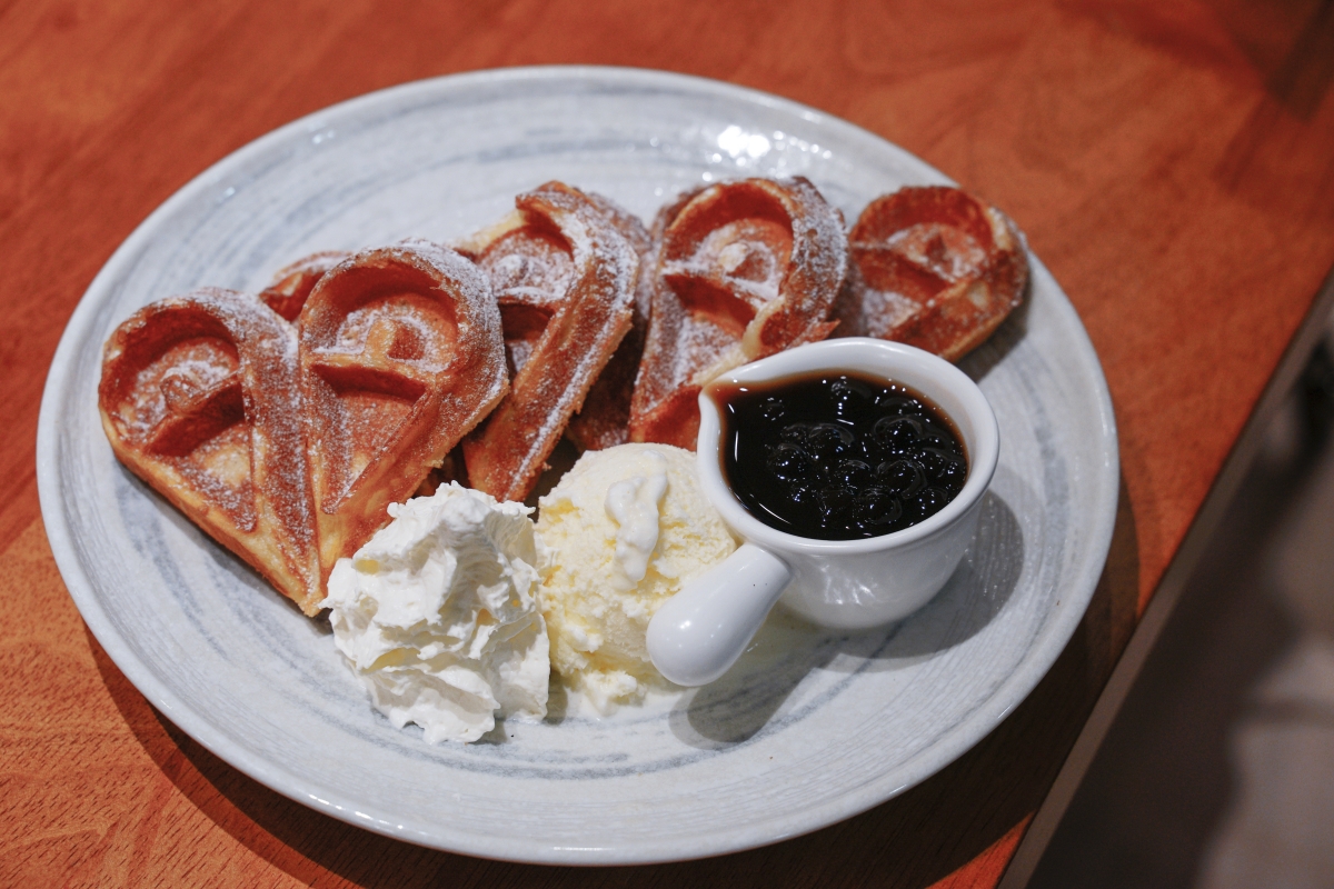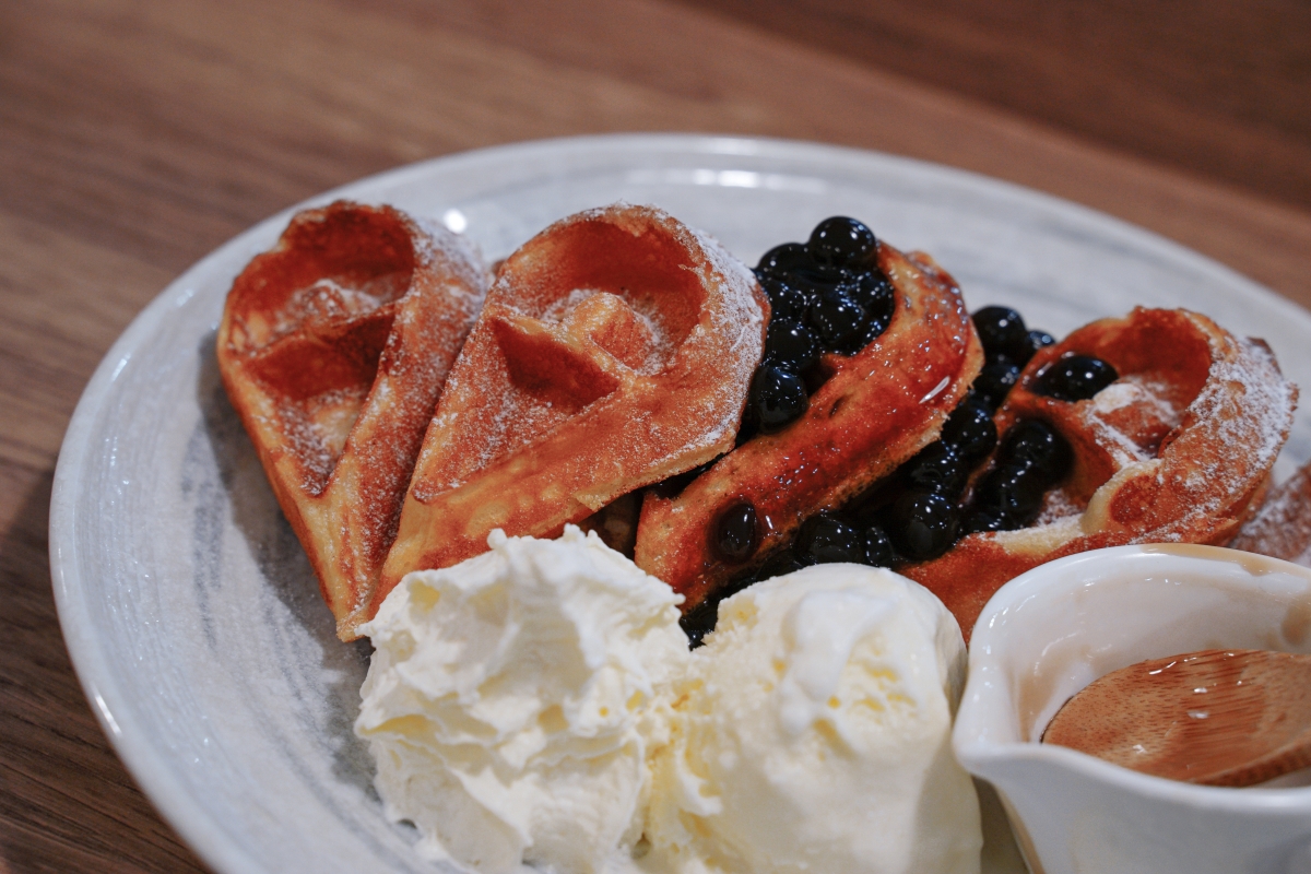 店家自製的鬆餅,重點是裡面有包麻糬!自從貳參咖啡沒有提供鬆餅後,我真的好久沒吃到麻糬鬆餅了~實在好想念這外酥內 Q的療癒口感,撒上些糖粉,再淋上黑糖珍珠,香香甜甜的。鬆餅可以搭配旁邊的鮮奶油或是冰淇淋一起入口更幸福!
