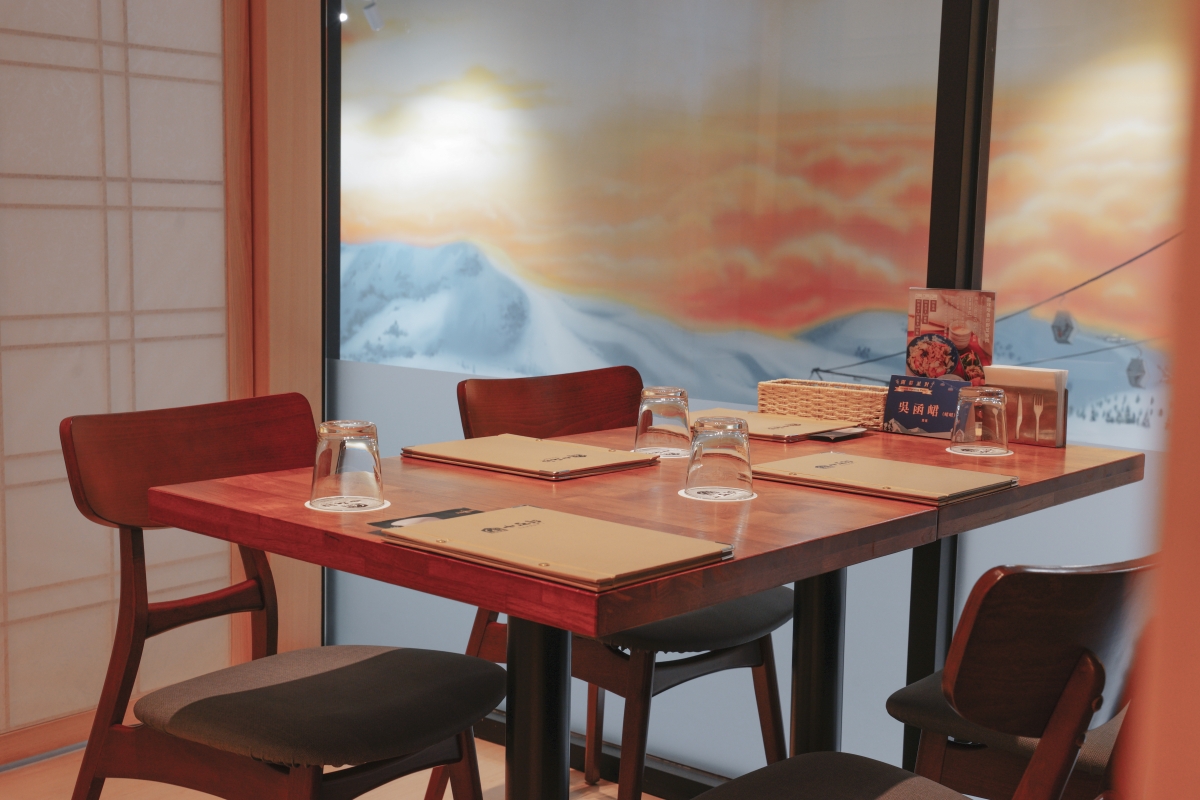 二樓的用餐空間視野較好,可以一邊用餐吃飯一邊看人上課滑雪,如果有朋友去上課,也可以在樓上喝杯飲料看朋友練習或是跌倒(笑)。除了一般座位空間,旁邊有設置包廂空間,包廂與包廂間是用簡單的拉簾隔間,因此也可以全開作為多人聚餐的空間。如果不希望被打擾或是想要擁有較高隱私的獨立用餐空間可以事先電話預訂哦。