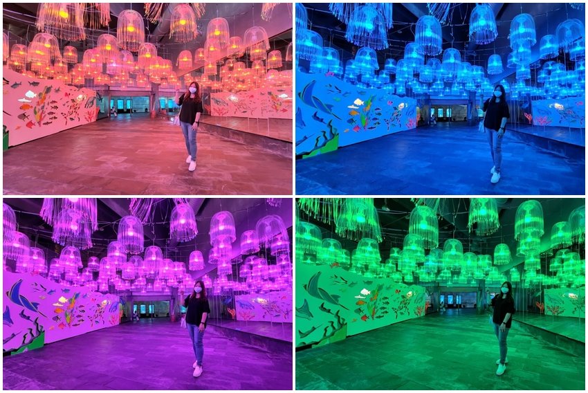 ▼另外必拍的還有光之水母隧道,不僅會變換顏色,加上大面鏡面反射與牆面上的螢光畫作,看起來繽紛又夢幻,拍起來超級漂亮!
