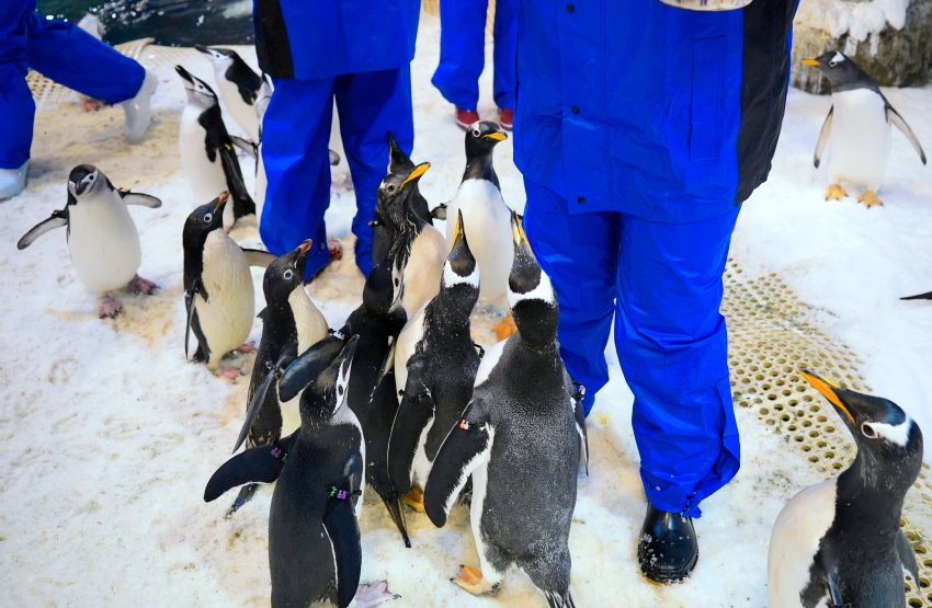 ▼講解完畢之後就交給企鵝保姆啦~~~進入企鵝缸前又要開始再次著裝、消毒啦~同樣踩踏過消毒水之後,就可以依照飼育人員的指示來換裝~~而且連雨鞋也要再換另一雙,為了保護企鵝大家可不要嫌麻煩啊!這時候手機就要收起來請飼育人員統一保管,進缸後也會有專門的飼育人員幫大家跟企鵝拍照唷!