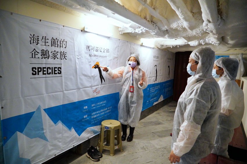 ▼穿上防護衣之後,就會開始介紹企鵝的品種與特色,像這次進缸可以餵食到四種不同的企鵝,像馬可羅尼就是裡頭體型最高大的,另外還有巴布亞企鵝、頰帶企鵝、阿德利企鵝,其中酷企鵝就是以阿德利企鵝為原型所繪製而成,整個讓人很期待啊!