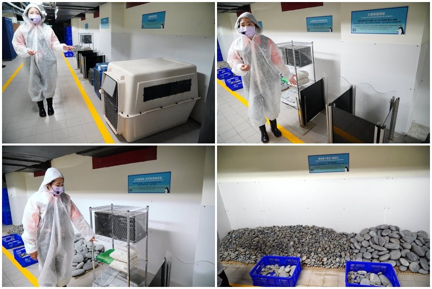 ▼接著還有一個一個很像是裝寵物的六角箱,依照不同企鵝品種體型的大小不同來分別盛裝,每一籠只能裝一隻,這裡的企鵝也是裝在裡頭坐很久的飛機才來到台灣,所以需要有足夠的活動空間與空氣對流才行!另外還有隔離箱,也就是企鵝寶寶的月子中心,像是企鵝的觀察期、換羽期或隔離期等都會使用到~~另外水質也是很重要的,經由層層過濾把關,也要管控企鵝不要誤食到不乾淨的生物,以維護企鵝的健康!最後這個鵝卵石也很促咪,除了企鵝會拿來建造自己的小窩之外,也是求偶必備,據說公企鵝會銜著一顆自己喜愛的鵝卵石(甚至愛心造型)向母企鵝求偶,如果母企鵝同意就會將鵝卵石叼過去,然後做完該做的事之後就準備生小企鵝了(笑)~~~