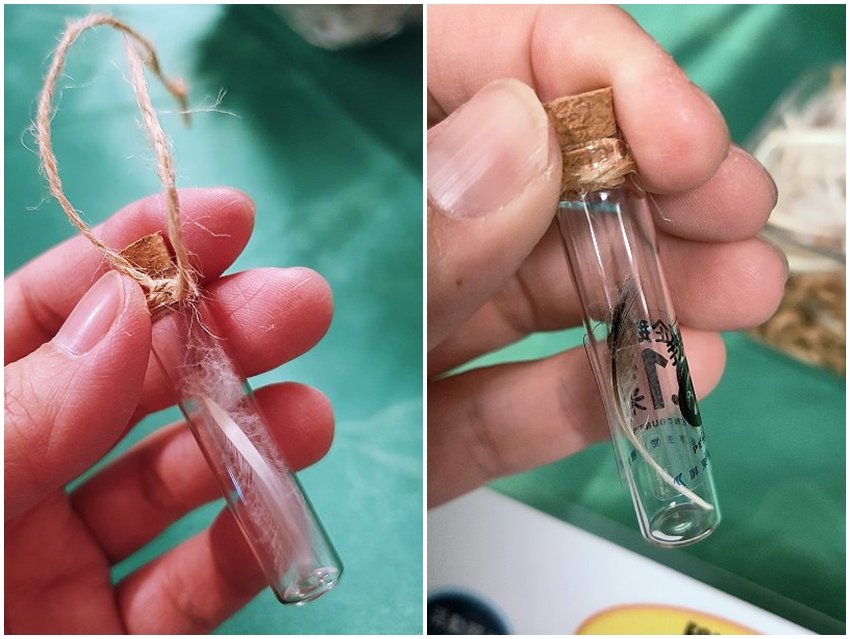 ▼口咩選了一根純白色的羽毛,大口則是挑了帶有點黑色的羽毛,放進去後蓋上軟木塞,貼上貼紙、綁上麻繩就大功告成啦!