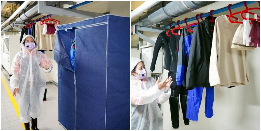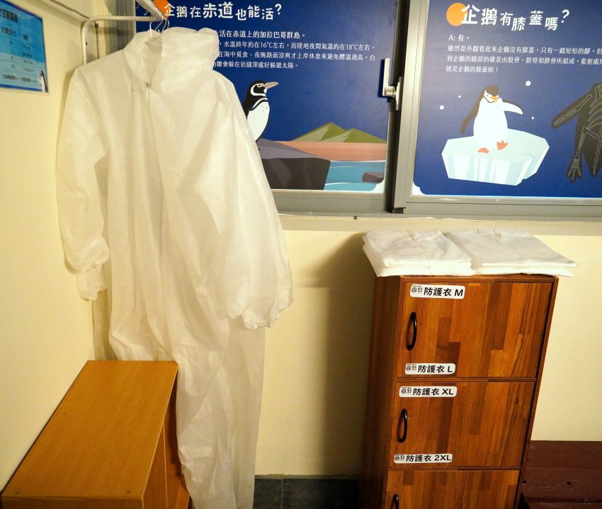 ▼最後使用過的隔離衣需要清洗、消毒、晾乾才能重複使用,另外也有一般飼育人員的裝備及潛水衣,都是為了餵食、照顧企鵝、清潔企鵝缸所需穿到的唷!