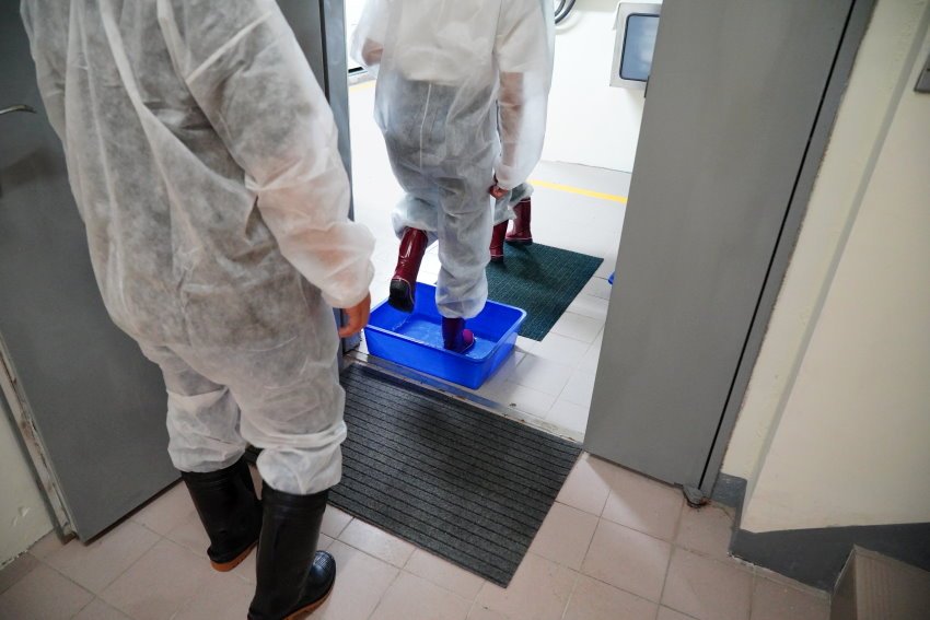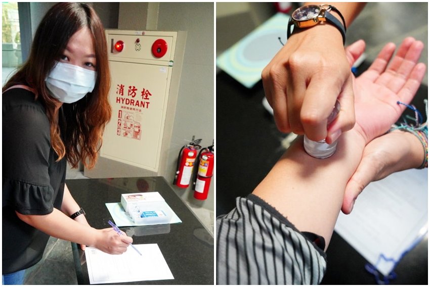 ▼消毒也很嚴格,需要先踏進消毒毯、消毒水、消毒毯之後,再噴酒精消毒雙手!
