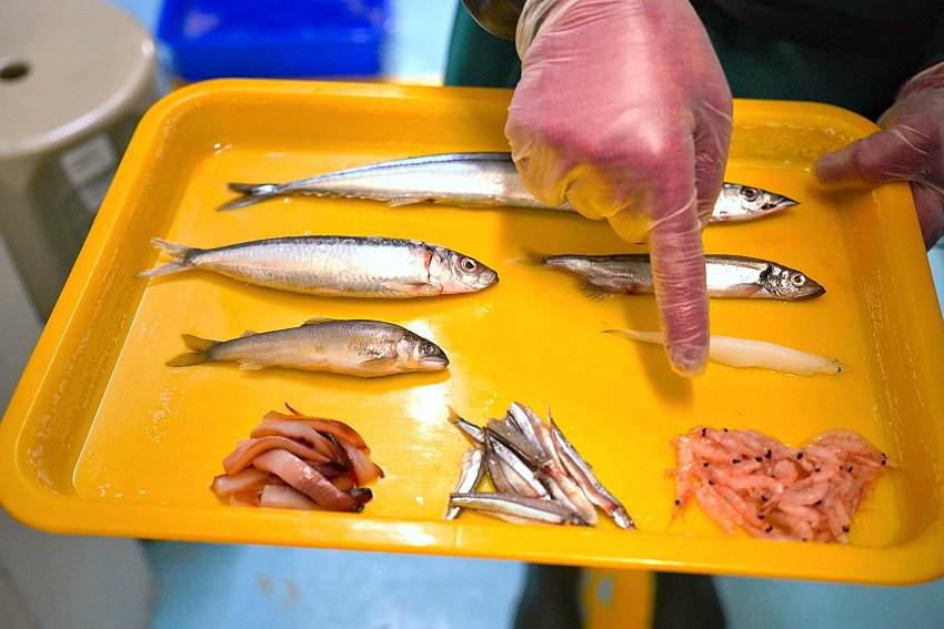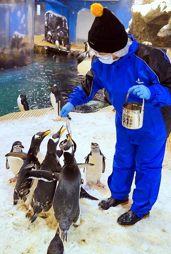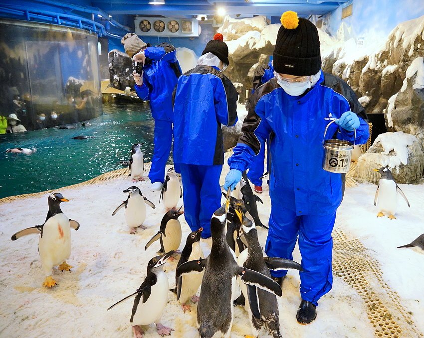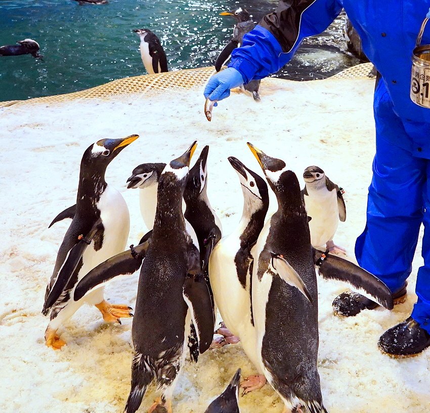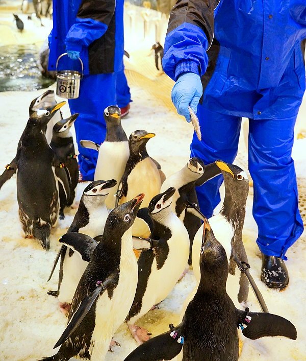 ▼企鵝保姆還會先講解一下企鵝的食物,包括南極蝦、丁香魚、魷魚等都會混搭讓企鵝享用!此外也有銀魚、香魚、柳葉魚、小型鯖魚、秋刀魚等,都是企鵝最愛的食物唷!