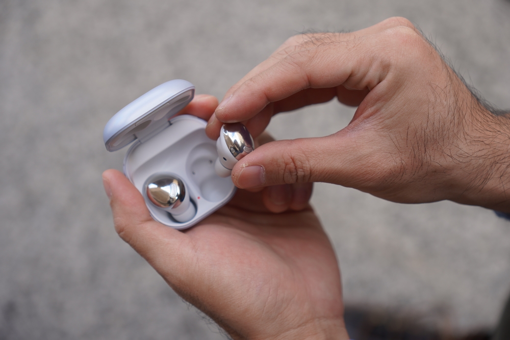 Galaxy Buds Pro 耳機本體頗為小巧,戴在耳朵上的穩定度也很不錯,造型設計很適合我的耳型,內附三個尺寸不同的耳塞,選好適合自己耳型的尺寸後,就能有舒適的配戴效果、被動噪音的阻隔能力也很不錯。