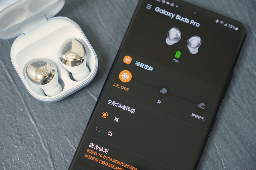 Galaxy Buds Pro 提供了非常出色的 ANC 主動式智慧降噪功能,和手機配對之後可以調整兩段式降噪效果,最高可以消除 99% 的背景噪音,在聽音樂的時候可以不受環境的冷氣運轉聲、引擎聲等低沉噪音干擾,能專注在音樂裡面。