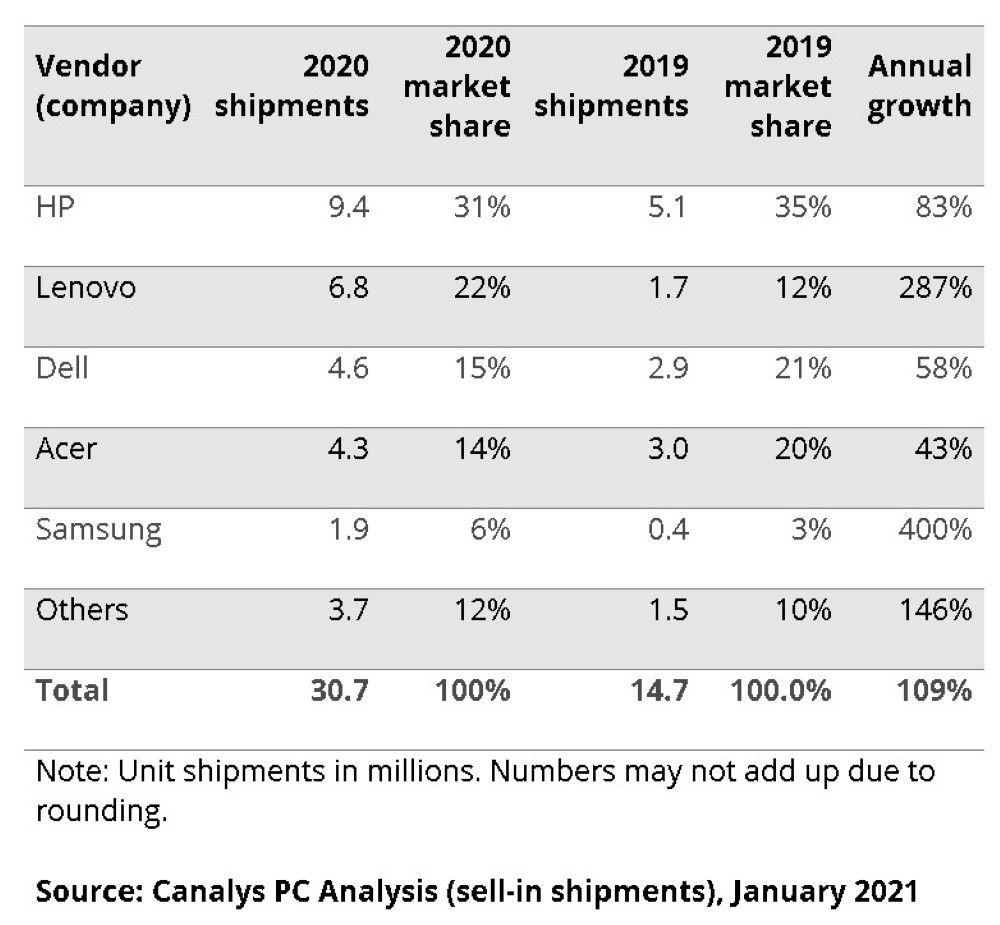 Canalys 研究人員指出,Chromebook 去年全球銷售表現堪稱是「歷來最佳」。2020 年第 4 季全球出貨量達 1,120 萬台 ,與 2019 年同期(290 萬台)相比成長 287%。