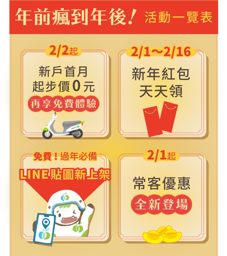 活動內容:會員天天打開 App 即可參加搶紅包活動,超過價值百萬的騎乘金及 LINE POINTS 點數。租借 WeMo Scooter 車輛,化身移動紅包車,打開車廂就有機會獲得過年紅包好禮。
