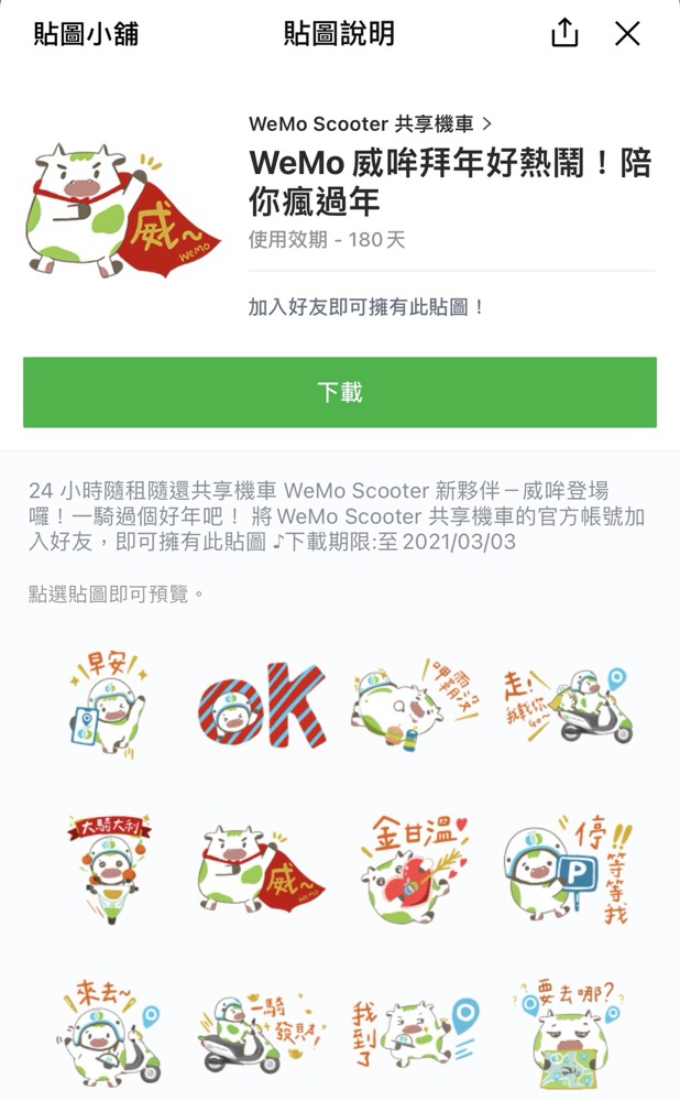 活動內容:推出「WeMo 威哞拜年好熱鬧!陪你瘋過年」免費 LINE 貼圖,用可愛專屬威哞牛牛形象跟親友長輩拜新年,一起威風過牛年。