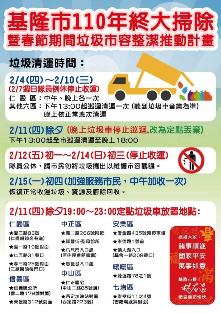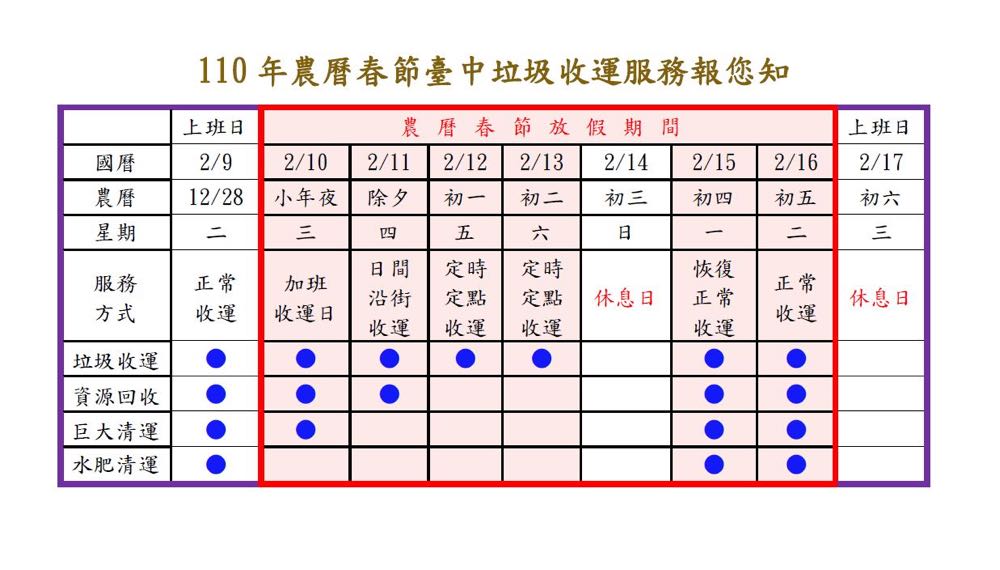 相關連結:臺南市春節期間各區清潔隊垃圾清運時間表