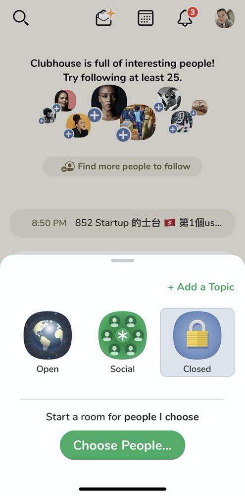 當主持人的時候,可以選擇「+Start a room 」開啟新的聊天室,也就是大家會聽到的「你等等要不要開房間」,可以開啟的聊天室會依照隱私權限分為:公開(全世界隨機看到的都能進來)、社交(有追隨你的朋友可以進來)、封閉(只有你挑的朋友可以進來)三種類型。