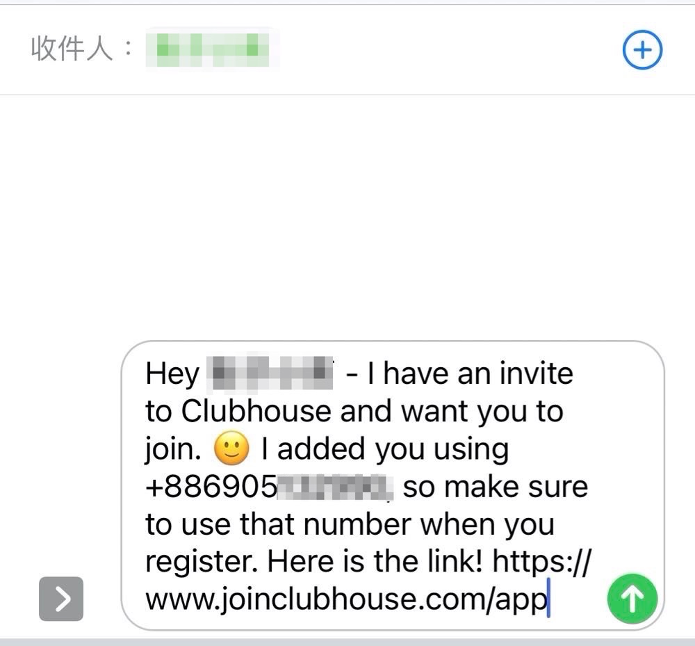 3) 使用邀請函:最直接也最簡單的。每個會員一開始會有 2 個邀請名額,只要你的電話有在對方的聯絡人之中,對方就能對你發送邀請,這時你就會從手機的簡訊中收到邀請碼,然後登入 Clubhouse。
