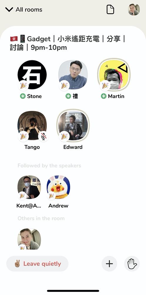 若是當聽眾,感覺會像是在聽 Podcast、廣播節目,只不過人數更多,而且過程中如果想要發表意見的時候,就能夠按下右邊的「舉手」符號來等待主持人的同意即時加入討論。也因為 Clubhouse 主打的是「語音體驗」,因此在聊天室中僅能用麥克風來參與聊天,並無法使用表情符號、文字留言等其他方式來交流,卻也是因爲如此,所有使用者在聊天室中的聊天過程會是相當的自在,並不用擔心被別人的噓聲留言等擾亂節奏。