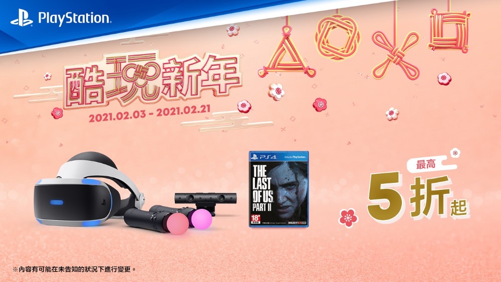 即日起至 2 月 1 日,購買 PlayStation VR(PS VR)豪華全配包及精選 PlayStation 4(PS4)遊戲即可享有優惠(銷售點)。此外,即日起購買 PS Plus 12 個月會籍還享有新春優惠,PS Store 上多款遊戲也會以優惠價出售。