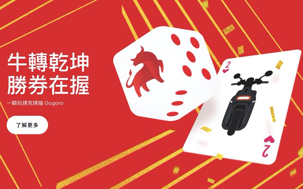牛轉乾坤迎新年,即日起至 2/22,到 Gogoro 全台門市賞車並完成問卷,就能參加開運遊戲,擲骰子、比抽牌、參加抽籤,有機會獲得 「Gogoro 一騎玩撲克牌」,還有品牌紅包袋、口罩、便條紙等眾多好禮。Gogoro 優惠活動不只如此,還可參加「騎心高照 好事成雙」活動,把經典車款 Gogoro S3 抽回家;下訂購車再加碼,抽獎機會翻 10 倍。