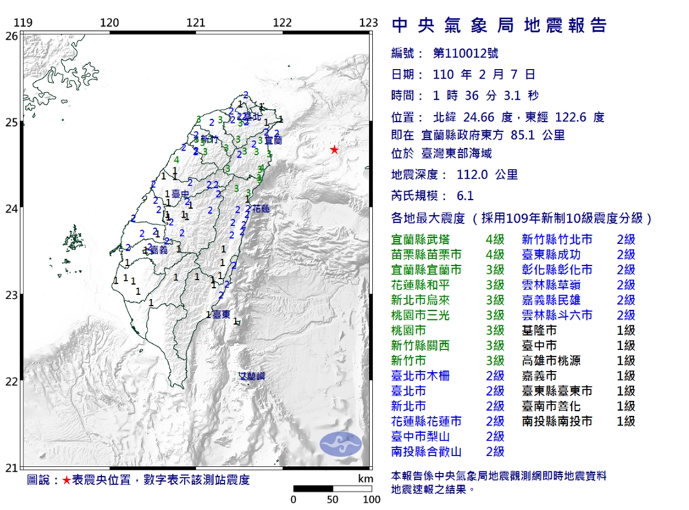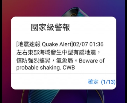 相信不少朋友在稍早(7日)凌晨時間 1 點 40 分左右,手機都收到多封「國家級警報」通知,起因是發生於 2021 年 2 月 7 日 01:36 的第 012 號顯著有感地震,震央在宜蘭東方、台灣東部海域,芮氏規模為 6.1,在宜蘭縣、苗栗縣地區的最大震度為 4 級,新北市、桃園市、新竹縣市等地區最大震度也有 3 級。
