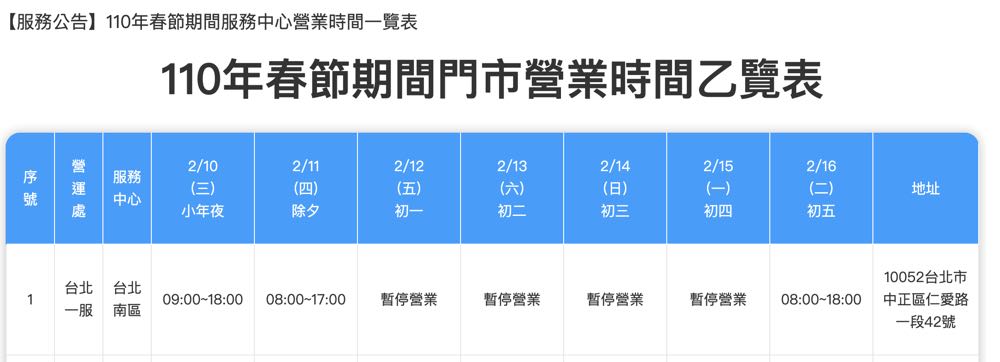 服務據點:2021 春節過年中華電信開放服務據點