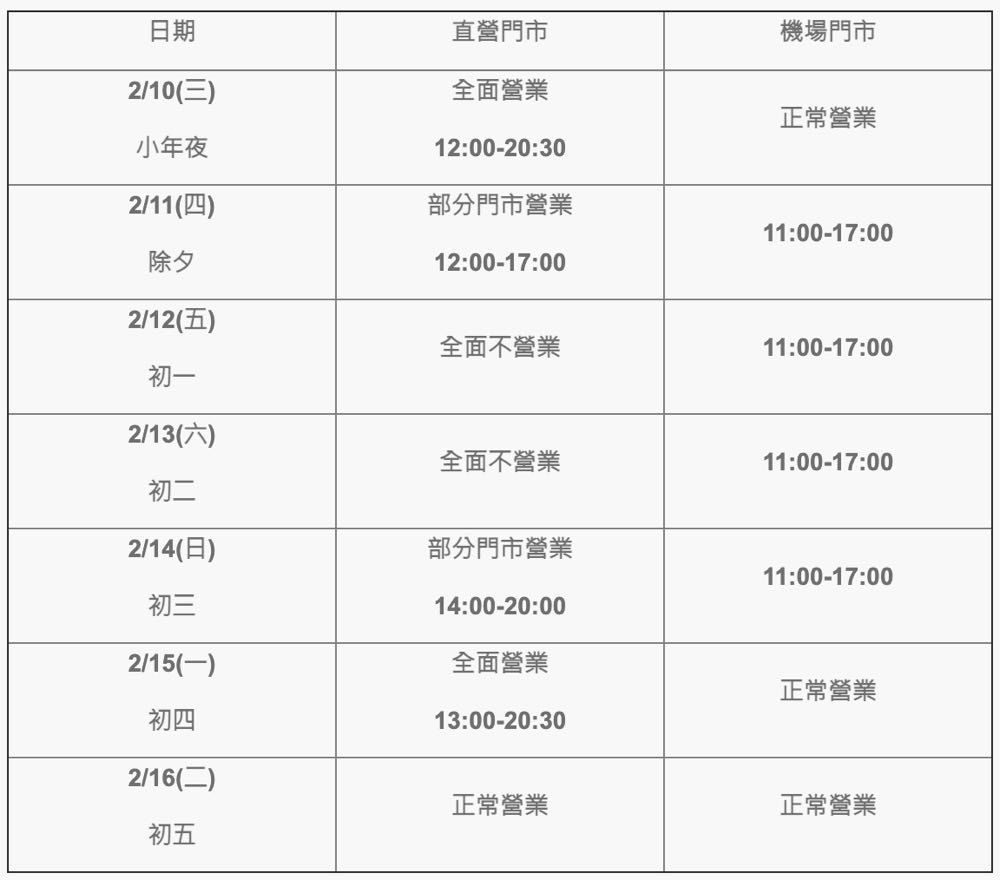 除夕(2 月 11 日) 當天 17:00 提早結束營業;