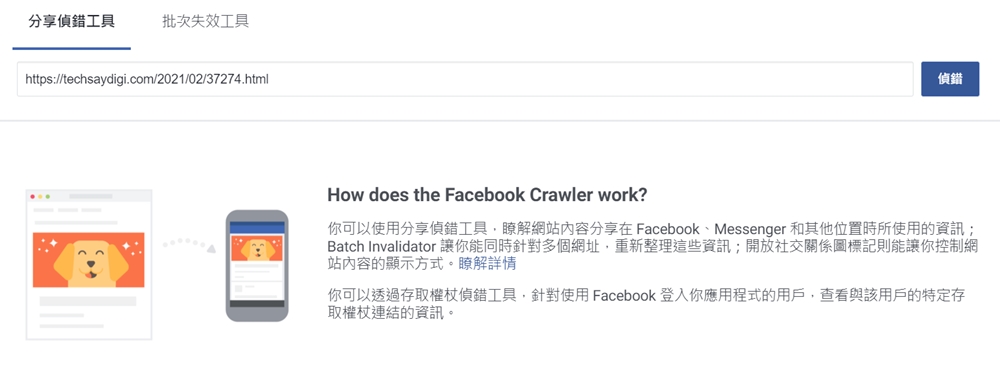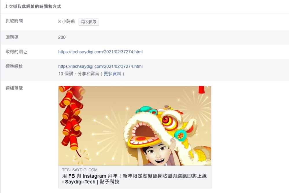 先確認已將連結資訊(文字、圖片等)更新好,接著在「分享偵測工具」的頁面中,貼上想要在 Facebook 分享的網址,並按下「偵錯」,即會進入下一頁,頁面中會顯示上次抓取該網址的時間,比如下圖中看到的連結預覽圖片、文字等都是 8 小時前 Facebook 抓取的資料,此時只要按下抓取時間旁邊的「再次抓取」,就可以更新到最新的資料,連結預覽也會跟著顯示為最新的圖片與文字。
