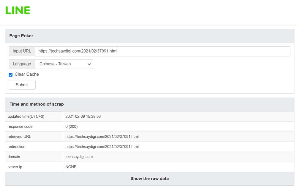 至於 LINE 台灣官方目前並沒有提供相關的偵錯工具,筆者在網路上找到一個日本的官方連結,使用方式與 Facebook 偵錯工具類似, 貼上網址後選擇語言,打勾「Clear Cache」的欄位,並按下「Submit」後,的確有出現更新時間等相關訊息,不過在 LINE 分享中的顯示並沒有及時的更新,也有網友說送出後需要等上一段時間,讓爬蟲更新資訊後才會顯示。