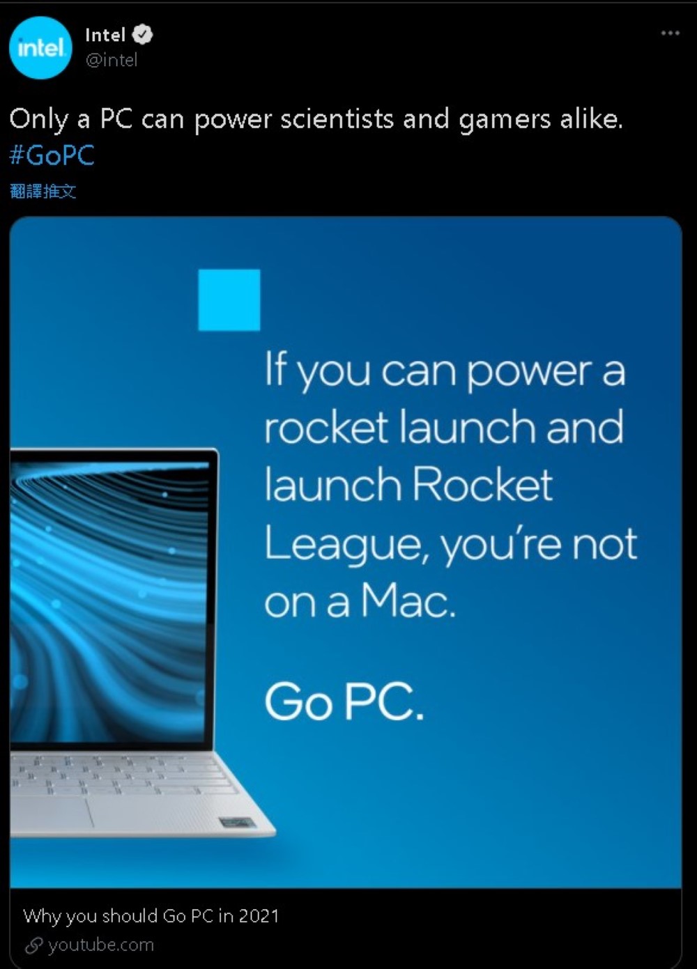 Intel 近期在 Twitter 上發出一系列廣告,內容主要在數落 Mac 缺點,例如 Mac 遊戲種類不如 PC,或者諷刺 Mac 缺少平板功能等。且推文最後都會附上「GoPC」標籤,呼籲大家捨棄 Mac,投向 PC 的懷抱。