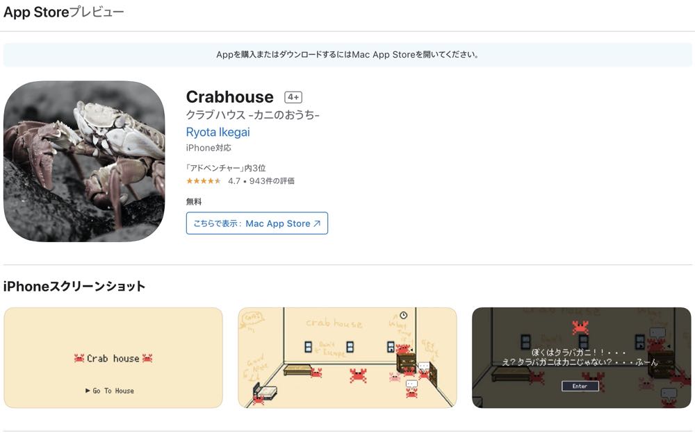 日本遊戲設計師 GAI 表示因為不知道怎麼玩 Clubhouse 後索性設計出這款《Crabhouse》,使用點陣畫風跟可愛的螃蟹風格,玩家並不能直接交談,而是藉由內建 39 種和螃蟹有關的對話來進行互動。螃蟹們會隨著朋友來訪或離開數量有所增減,螃蟹偶爾還會出現稀有的綠色、桃紅色螃蟹。